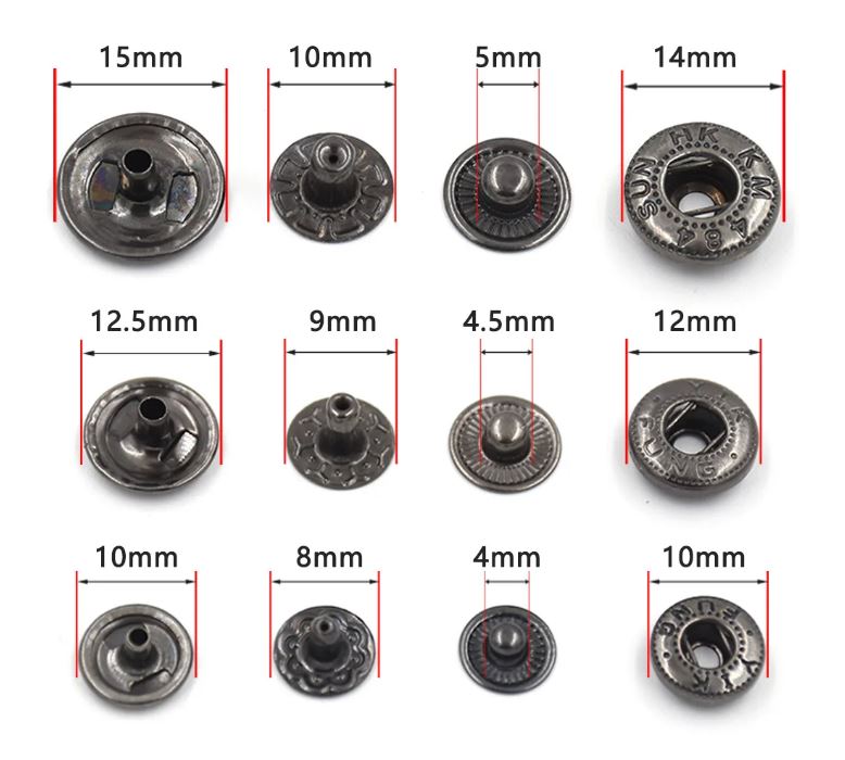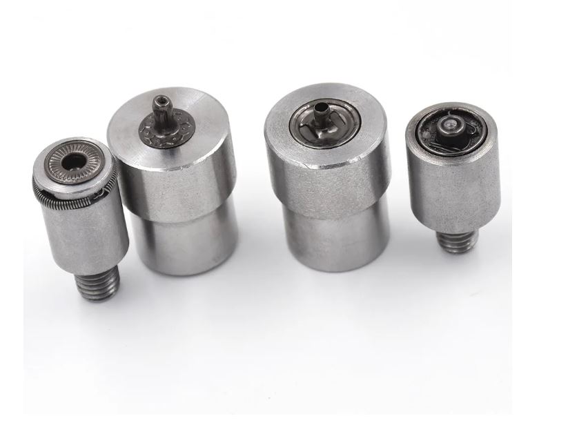 Šie antgaliai tiks prie mūsų parduodamo preso arba bet kurio kito preso, kurio įsukamos dalies srėgis viršuje yra 8mm, o apačioje įstatoma puansono dalis 19mm skersmens. Su šiais antgaliai galėsite įstatyti 15 mm spaudes, kurių rasite rinkinyje 10 vnt., o vėliau galėsite įsigyti bet kurioje parduotuvėje, kuri prekiaujama siuvimo reikmenimis, tereikės žinoti diametrą ir spaudžių rūšį. Nepamirškite, kad puansonas skirtas tik 15 mm spaudėm, kito dydžio spaudžių su juo neįstatysite. Kievienam spaudžių diametrui reikalingas vis kitas puansonas. Kad galėtume įstatyti spaudę turite turėti keturias jos ir puansono dalis. Nuotraukuose pavaizduota kokiais tai dalys ir kuri dalis į kokį puansoną dedasi. Spaudės dažniausiai naudojamos rūbuose, gali būti naudojamos ir kaip dekoras. Patarimas, dedant spaudes į trikotažines elastingas medžiagas spaudės vietą reikėtų paklijuoti.