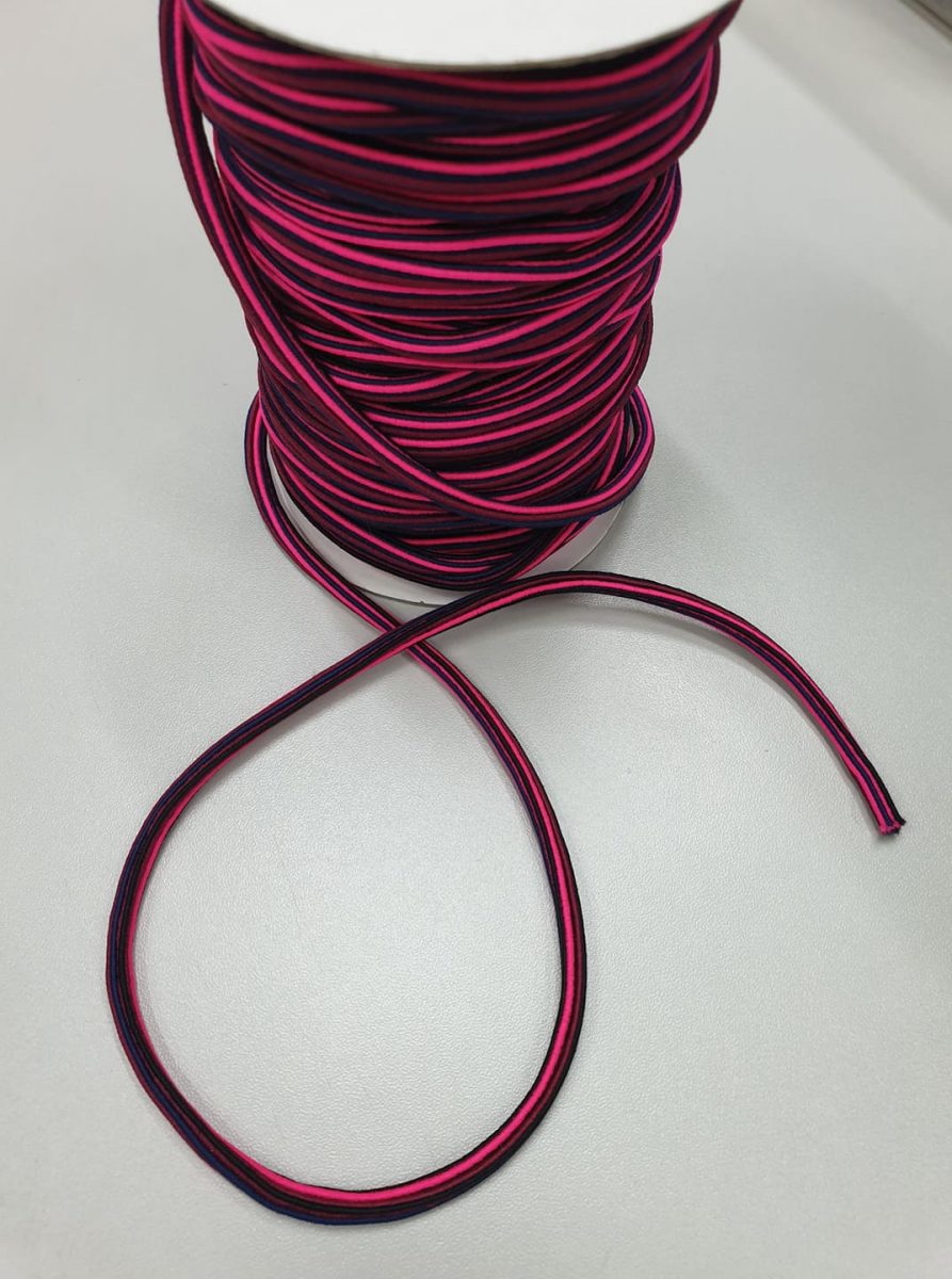 Apvali minkšta elastinė guma 3 mm, juoda/rožinė. Elastinė juostelė – tai dažniausiai buityje, rūbų siuvimui naudojama guma. Ši guma tinkama dekoravimui, rūbų paraukimui ir net šiaip buityje. Elastinė juostelė (guma) yra naudojama siuviniuose tam, kad galėtume išgauti gaminio tamprumą atitinkamose jo vietose. Tai viena reikalingiausių priemonių kiekvienos siuvėjos aplinkoje. Gumos būna įvairiausių spalvų, pločio ir net tąsumo. Elastinės juostelės (gumos) būna austos, pintos, apvalios, yra gumos su kilpelėmis sagoms. Mūsų turima guma yra aukštos kokybės, tvirta, tinkamai naudojant ilgai išlaiko savo formą ir kokybę. Turime ir spalvotų elastinių juostelių (gumų), kurias galite derinti pagal savo siuvamo gaminio spalvą. Juostelės yra pačio įvairiausio pločio: nuo 1 mm iki 60 mm. Plotį taip pat reikėtų pasirinti pagal siuvamo gaminio stilių ir struktūtą. Guma yra karpoma, kaina nurodyta už 1 m.