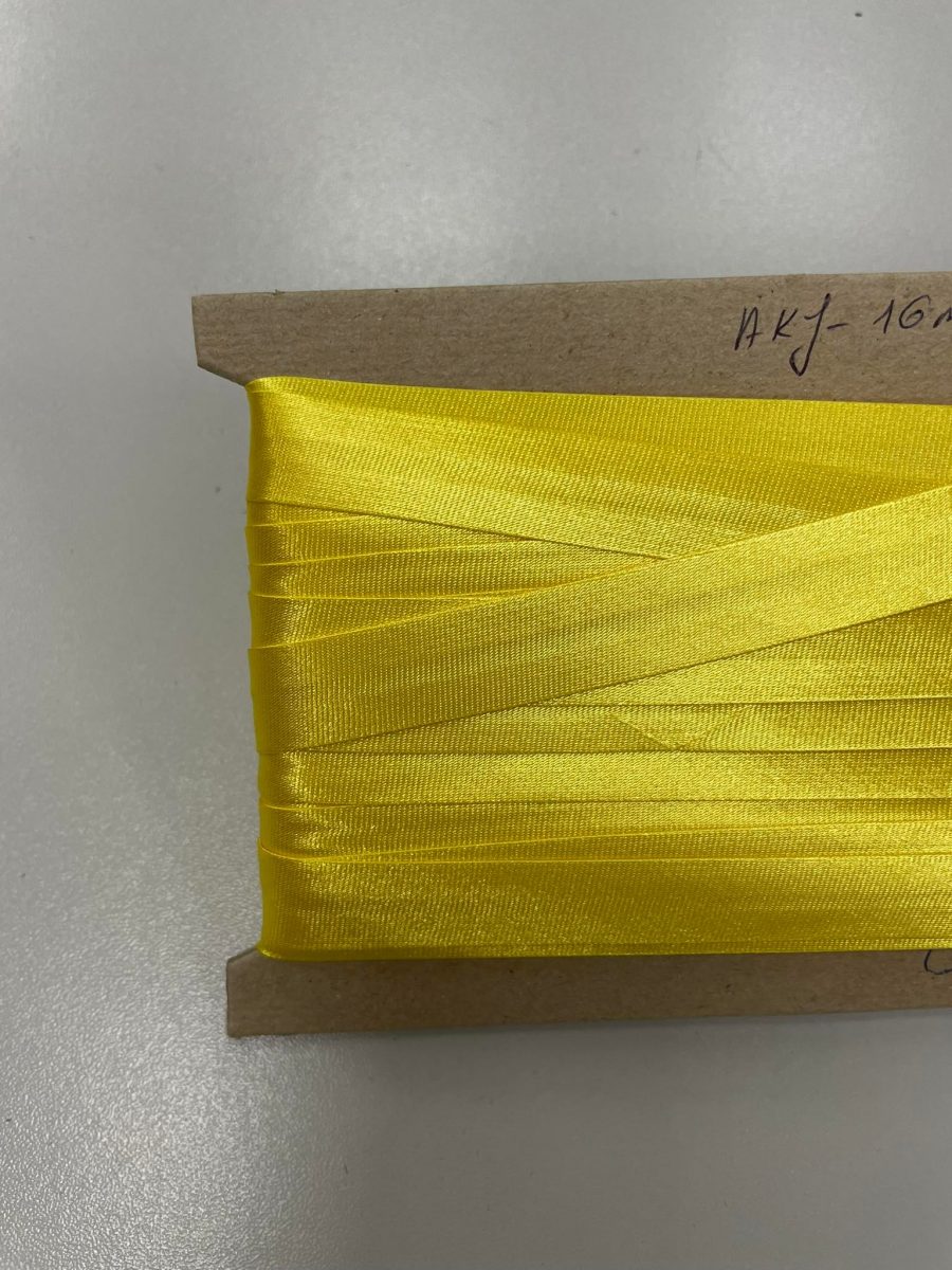 Atlasinė kantavimo juostelė R|yškiai geltona 16 mm – naudojama viršutinių – moteriškų, vyriškų bei vaikiškų rūbų, apatinio trikotažo apdailai, drabužių rankovių, apačios bei kaklo iškirpčių dekoravimui ir padailai. Kantavimo juostelė yra blizgi, slidi, su užlenktais kraštais ir paruošta dekoratyviniam kantavimui. Kantavimo juostelė skirta trikotažui ir ne tik.