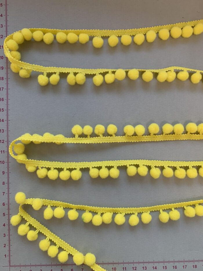 Dekoratyvinė Mini Pom-Pom juostelė, geltona. Pom-Pom juostelė yra dekoratyvinė juostelė, puošta minkštais ir maloniais rutuliukais. Rutuliukai gali būti pagaminti iš pačių įvairiausių medžiagų, tokių kaip: vilna, medvilnė, popieriaus, plastiko, siūlų, blizgučių, retkarčiais net iš plunksnų. Rutuliukų dydis ir juostelės plotis gali būti labai įvairūs. Pom-pom juostelė skirta įvairiems rankdarbiams dekoruoti. Jomis gali būti puošiami ne tik rūbeliai – skaros, kaklaskarės, suknelės, sijonai, tunikos, palaidinukės ir pan., bet ir namų aksesuarai, tokie kaip pagalvėles, anktlodės, servetėlės. Viename metre yra apie 85-90 vnt. rutuliukų. Dekoratyvinė juostelė, laikanti Pom Pom rutuliukus yra medvilninė, ją lengvai prisiūsite, priklijuosite ar kitaip pritvirtinsite prie dekoruojamo rūbo ar daikto. Esant būtinybei rutuliukus galima naudoti ir be juostelės. Pom Pom juostelių turime įvairių spalvų bei dydžių.