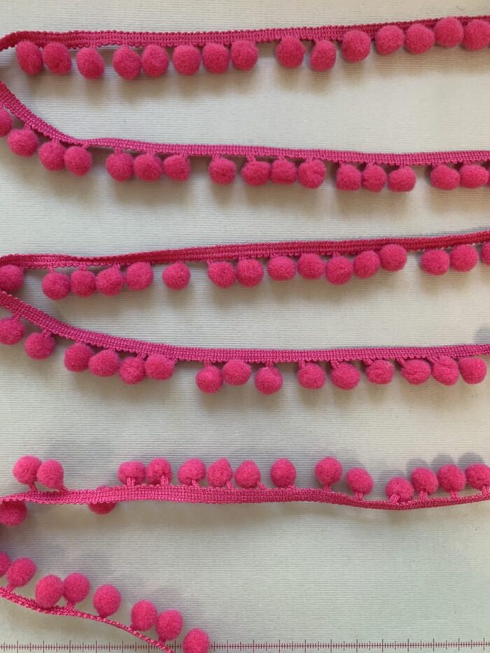 Dekoratyvinė Mini Pom-Pom juostelė, ryškiai rožinė. Pom-Pom juostelė yra dekoratyvinė juostelė, puošta minkštais ir maloniais rutuliukais. Rutuliukai gali būti pagaminti iš pačių įvairiausių medžiagų, tokių kaip: vilna, medvilnė, popieriaus, plastiko, siūlų, blizgučių, retkarčiais net iš plunksnų. Rutuliukų dydis ir juostelės plotis gali būti labai įvairūs. Pom-pom juostelė skirta įvairiems rankdarbiams dekoruoti. Jomis gali būti puošiami ne tik rūbeliai – skaros, kaklaskarės, suknelės, sijonai, tunikos, palaidinukės ir pan., bet ir namų aksesuarai, tokie kaip pagalvėles, anktlodės, servetėlės. Viename metre yra apie 85-90 vnt. rutuliukų. Dekoratyvinė juostelė, laikanti Pom Pom rutuliukus yra medvilninė, ją lengvai prisiūsite, priklijuosite ar kitaip pritvirtinsite prie dekoruojamo rūbo ar daikto. Esant būtinybei rutuliukus galima naudoti ir be juostelės. Pom Pom juostelių turime įvairių spalvų bei dydžių.