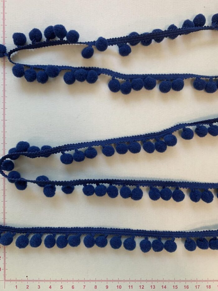 Dekoratyvinė Mini Pom-Pom juostelė, tamsiai mėlyna. Pom-Pom juostelė yra dekoratyvinė juostelė, puošta minkštais ir maloniais rutuliukais. Rutuliukai gali būti pagaminti iš pačių įvairiausių medžiagų, tokių kaip: vilna, medvilnė, popieriaus, plastiko, siūlų, blizgučių, retkarčiais net iš plunksnų. Rutuliukų dydis ir juostelės plotis gali būti labai įvairūs. Pom-pom juostelė skirta įvairiems rankdarbiams dekoruoti. Jomis gali būti puošiami ne tik rūbeliai – skaros, kaklaskarės, suknelės, sijonai, tunikos, palaidinukės ir pan., bet ir namų aksesuarai, tokie kaip pagalvėles, anktlodės, servetėlės. Viename metre yra apie 85-90 vnt. rutuliukų. Dekoratyvinė juostelė, laikanti Pom Pom rutuliukus yra medvilninė, ją lengvai prisiūsite, priklijuosite ar kitaip pritvirtinsite prie dekoruojamo rūbo ar daikto. Esant būtinybei rutuliukus galima naudoti ir be juostelės. Pom Pom juostelių turime įvairių spalvų bei dydžių.