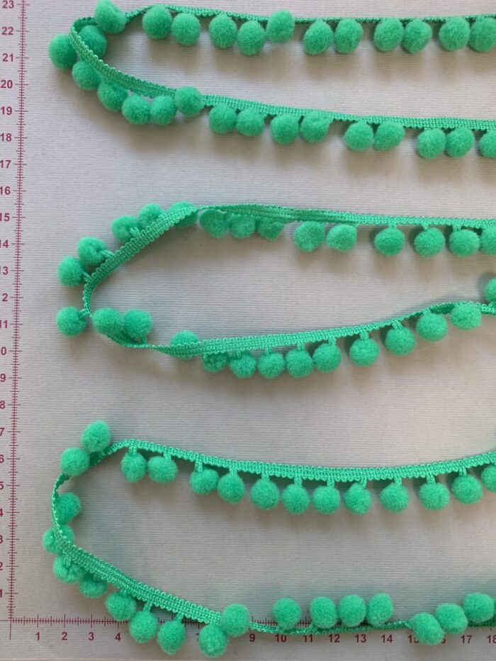 Dekoratyvinė Mini Pom-Pom juostelė, žalia. Pom-Pom juostelė yra dekoratyvinė juostelė, puošta minkštais ir maloniais rutuliukais. Rutuliukai gali būti pagaminti iš pačių įvairiausių medžiagų, tokių kaip: vilna, medvilnė, popieriaus, plastiko, siūlų, blizgučių, retkarčiais net iš plunksnų. Rutuliukų dydis ir juostelės plotis gali būti labai įvairūs. Pom-pom juostelė skirta įvairiems rankdarbiams dekoruoti. Jomis gali būti puošiami ne tik rūbeliai – skaros, kaklaskarės, suknelės, sijonai, tunikos, palaidinukės ir pan., bet ir namų aksesuarai, tokie kaip pagalvėles, anktlodės, servetėlės. Viename metre yra apie 85-90 vnt. rutuliukų. Dekoratyvinė juostelė, laikanti Pom Pom rutuliukus yra medvilninė, ją lengvai prisiūsite, priklijuosite ar kitaip pritvirtinsite prie dekoruojamo rūbo ar daikto. Esant būtinybei rutuliukus galima naudoti ir be juostelės. Pom Pom juostelių turime įvairių spalvų bei dydžių.