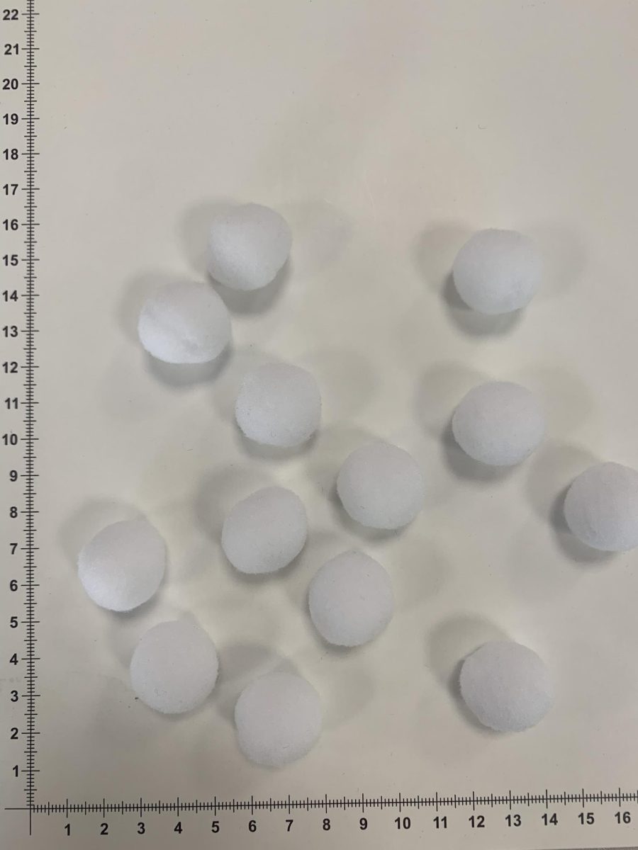 Dekoratyviniai atskiri Pom-Pom rutuliukai, balti. Rutuliukai gali būti pagaminti iš pačių įvairiausių medžiagų, tokių kaip: vilna, medvilnė, popieriaus, plastiko, siūlų, blizgučių, retkarčiais net iš plunksnų. Rutuliukų dydis gali būti labai įvairūs. Pom-pom rutuliukai skirti įvairiems rankdarbiams dekoruoti. Jais gali būti puošiami ne tik rūbeliai – skaros, kaklaskarės, suknelės, sijonai, tunikos, palaidinukės ir pan., bet ir namų aksesuarai, tokie kaip pagalvėles, anktlodės, servetėlės. Dekoratyviniai rutuliukai, lengvai priklijuojami ar kitaip pritvirtinami prie dekoruojamo rūbo ar daikto.