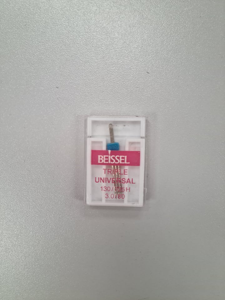 Dviguba adata Triple Universal 80/3,0, BEISSEL. Kiekvienai siuvėjai siuvant yra labai svarbus jos darbo įrankis – siuvimo mašina. Mašininės adatos yra viena svarbiausių siuvimo mašinos sudėtinių dalių. Siuvimo adatos skiriasi savo storiu, pagal savo storį turi ir atitinkamą numerį. Adatos numeris dažniausiai nurodomas dviem dydžiais: metrinės ir imperinės sistemos. pagal metrinę sistemą adatos numeris nurodo smaigalio storį šimtosiomis milimetro dalimis. Pavyzdžiui, 55 numerio adatos storis bus 0,55 mm, 120 – 1,2 mm. Siuvimo adata turi būti tiesi – jei siūsite lenta adata rūbo siūlė bus nelygi. Adata turi turėti blizgantį poliruotą paviršių ir gerai užaštrintą galiuką. Siuvimo adatos visada turi būti laikomos sausoje vietoje.