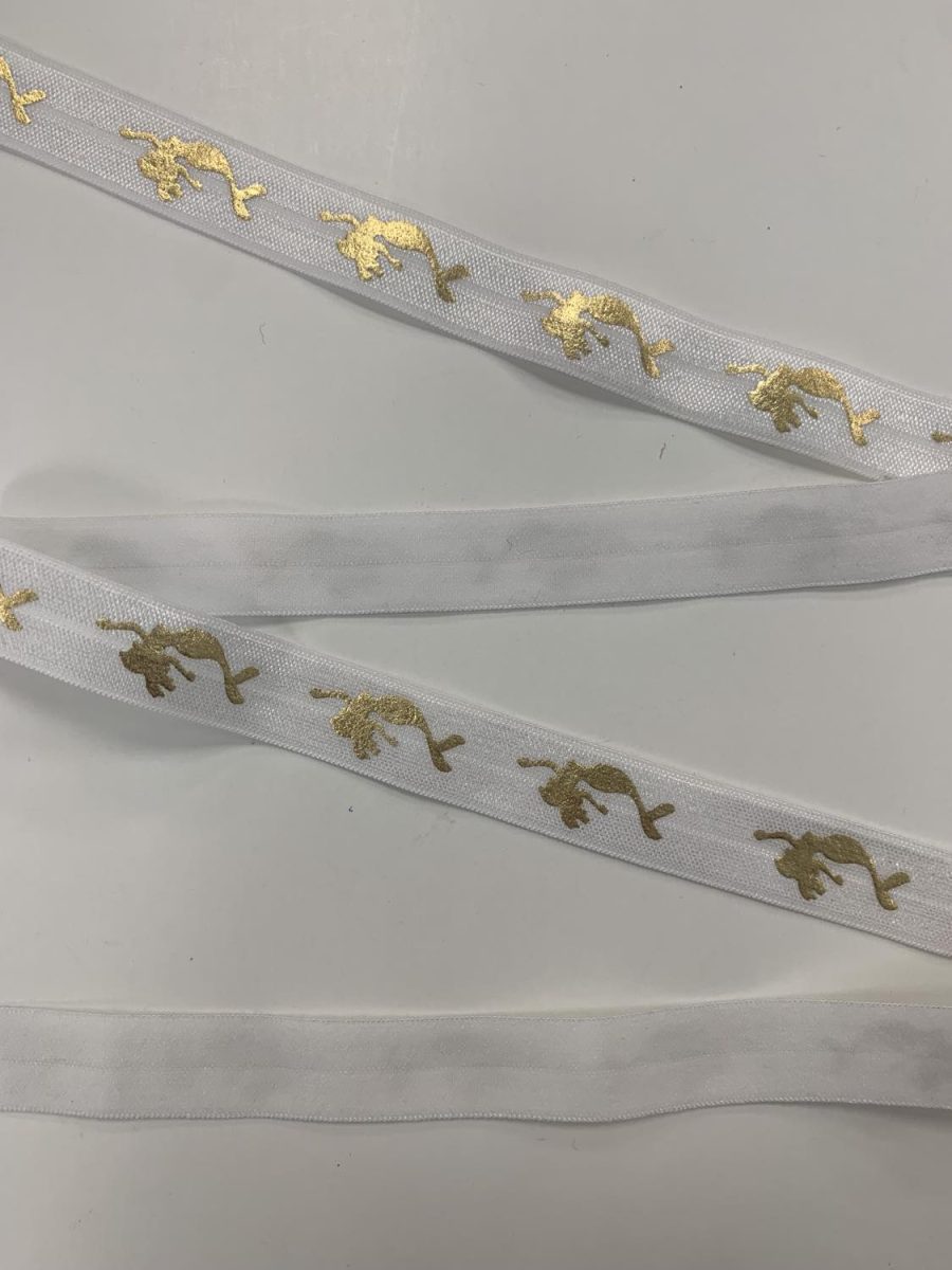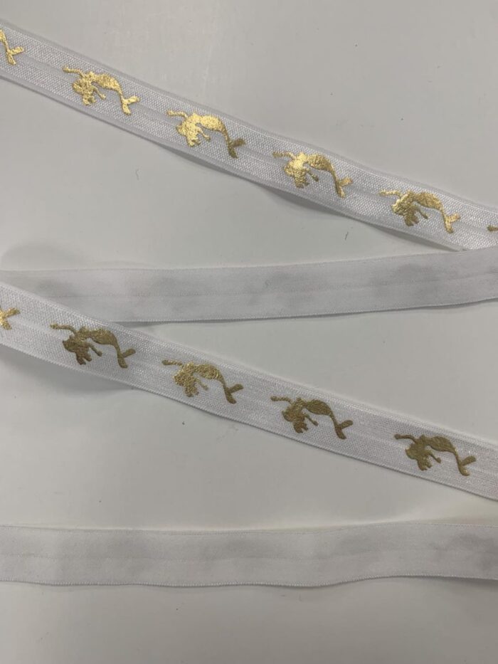 Elastinė kantavimo juostelė 16 mm, Balta su Undinėmis. Elastinė juostelė naudojama viršutinių – moteriškų, vyriškų bei vaikiškų rūbų, apatinio trikotažo apdailai, drabužių rankovių, apačios bei kaklo iškirpčių dekoravimui ir apadailai. Kantavimo juostelė yra blizgi, tampri, paruošta dekoratyviniam kantavimui. Kantavimo juostelė skirta trikotažui ir ne tik – tai dažniausiai naudojama kantavimo juostelė rūbų ar namų apyvokos daiktų – pagalvėlių, staltiesių, servetėlių dekoravimui. Elastinė kantavimo juostelė yra naudojama siuviniuose tam, kad galėtume išgauti gaminio tamprumą atitinkamose jo vietose. Tai viena reikalingiausių priemonių kiekvienos siuvėjos aplinkoje. Elastinės kantavimo juostelės būna įvairiausių spalvų, pločio ir net tąsumo. Mūsų turima elastinė kantavimo juostelė yra aukštos kokybės, tvirta, tinkamai naudojant ilgai išlaiko savo formą ir kokybę. Elastinės kantavimo juostelės yra karpomos, kaina nurodyta už 1 m. Ši elastinė kantavimo juostelė turi lenkimo liniją per vidurį, todėl ją siūti labai patogu.