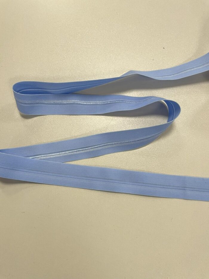 Elastinė kantavimo juostelė 25 mm, Šviesi melsva. Elastinė juostelė naudojama viršutinių – moteriškų, vyriškų bei vaikiškų rūbų, apatinio trikotažo apdailai, drabužių rankovių, apačios bei kaklo iškirpčių dekoravimui ir apadailai. Kantavimo juostelė yra tampri, paruošta dekoratyviniam kantavimui. Kantavimo juostelė skirta trikotažui ir ne tik – tai dažniausiai naudojama kantavimo juostelė rūbų ar namų apyvokos daiktų – pagalvėlių, staltiesių, servetėlių dekoravimui. Elastinė kantavimo juostelė yra naudojama siuviniuose tam, kad galėtume išgauti gaminio tamprumą atitinkamose jo vietose. Tai viena reikalingiausių priemonių kiekvienos siuvėjos aplinkoje. Elastinės kantavimo juostelės būna įvairiausių spalvų, pločio ir net tąsumo. Mūsų turima elastinė kantavimo juostelė yra aukštos kokybės, tvirta, tinkamai naudojant ilgai išlaiko savo formą ir kokybę. Elastinės kantavimo juostelės yra karpomos, kaina nurodyta už 1 m. Ši elastinė kantavimo juostelė turi lenkimo liniją per vidurį, todėl ją siūti labai patogu.