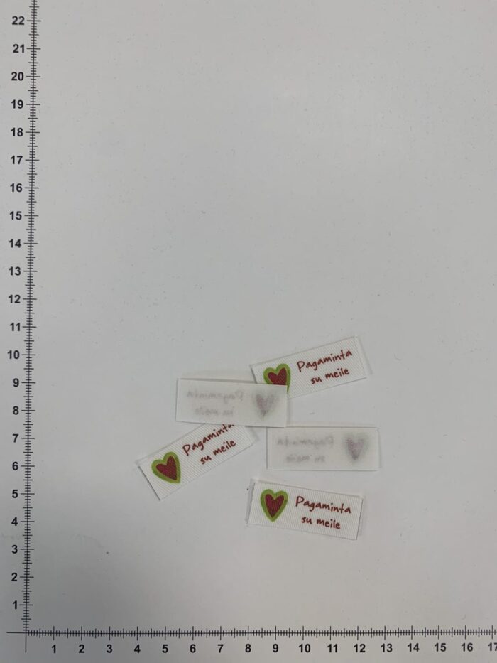 Etiketė Pagaminta su meile – tai kokybiška, prabangi, ir daug teigiamų emocijų skleidžianti tekstilinė etiketė. Tekstilinės etiketės dažniausiai naudojamos siuvimo pramonėje, norint pasiūtam rūbui suteikti orginalumo, išskirtinumo. Dažniausiai šios etiketės naudojamos drabužio ar kito gaminio viduje, mažiau matomoje vietoje. Ši etiketė yra atspausdinta ant poliesterinio audinio, ji yra balta, matinė, su žaismingu užrašu ir spalvotu paveiksliuku. Etiketė ypatinga tuo, kad atkirpus jos galai neišyra. Šios etiketės pritvirtinimas labai paprastas ir patogus: etiketė klijuojama karštuoju būdu (lygintuvu, presu), prieš tai nuo jos blogosios pusės nuėmus popierinę juostelę. Nerekomenduojame tvirtinant etiketę dėti lygintuvo ar preso tiesiai ant etiketės.