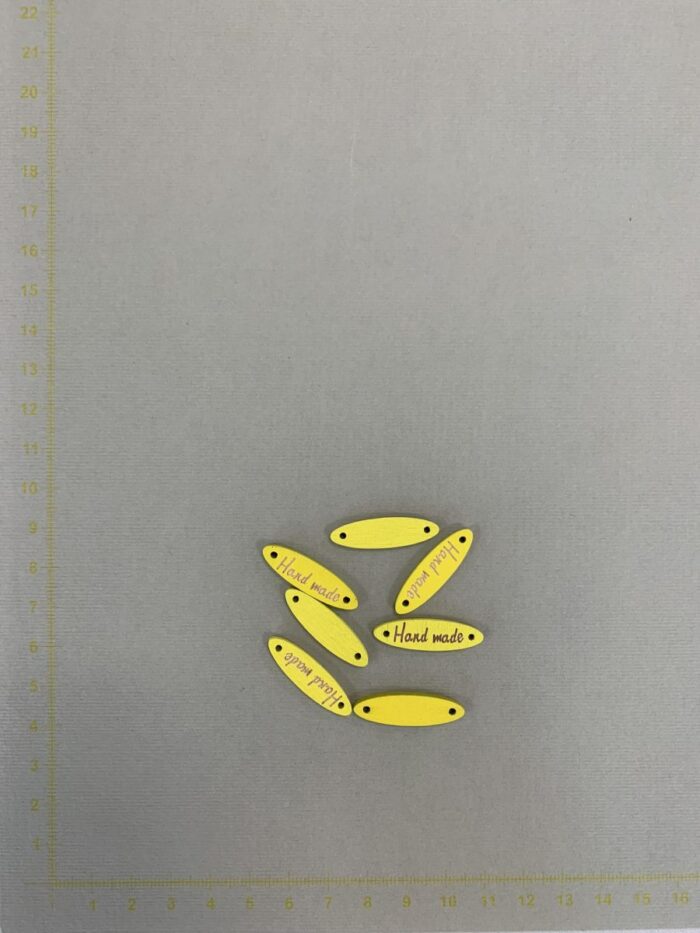 Geltona medinė etiketė Hand made, pailga – tai kokybiška, prabangi ir daug teigiamų emocijų skleidžianti medinė etiketė. Medinės etiketės dažniausiai naudojamos siuvimo pramonėje, norint pasiūtam rūbui suteikti orginalumo, išskirtinumo. Galima šias etiketes naudoti drabužio ar kito gaminio viduje, mažiau matomoje vietoje, tačiau jas puikiai galite tvirtinti ir išorinėje rūbo vietoje. Ši etiketė yra pagaminta iš natūralios medienos, nudažyta geltonai, užrašas išdegintas, todėl suteiks Jūsų pagamintam rūbui natūralumo, tuo pačiu tai bus įrodymas, kad rūbas tikrai pagamintas rankomis. Etiketė ypatinga tuo, kad yra labai lengva, pagaminta kokybiškai, neblunka, atspari skalbimui, yra ilgaamžė. Šios etiketės pritvirtinimas labai paprastas ir patogus: etiketės kraštuose yra nedidelės skylutės, jas puikiai galima prisiūti paprasta siuvimo adata. Etiketė lengva, todėl tikrai nesvers ir netemps net ir pačio lengviausio audinio. Užrašas Handmade (angl.) reiškia “Rankų darbo”. Etiketė skirta kiekvienos siuvėjos ir rūbo dėvėtojo pasididžiavimui!