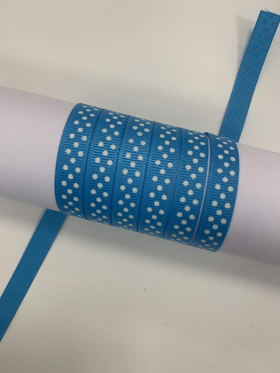 Grosgrain juostelė 10 mm, mėlyna Island Blue 328 su baltais taškeliais