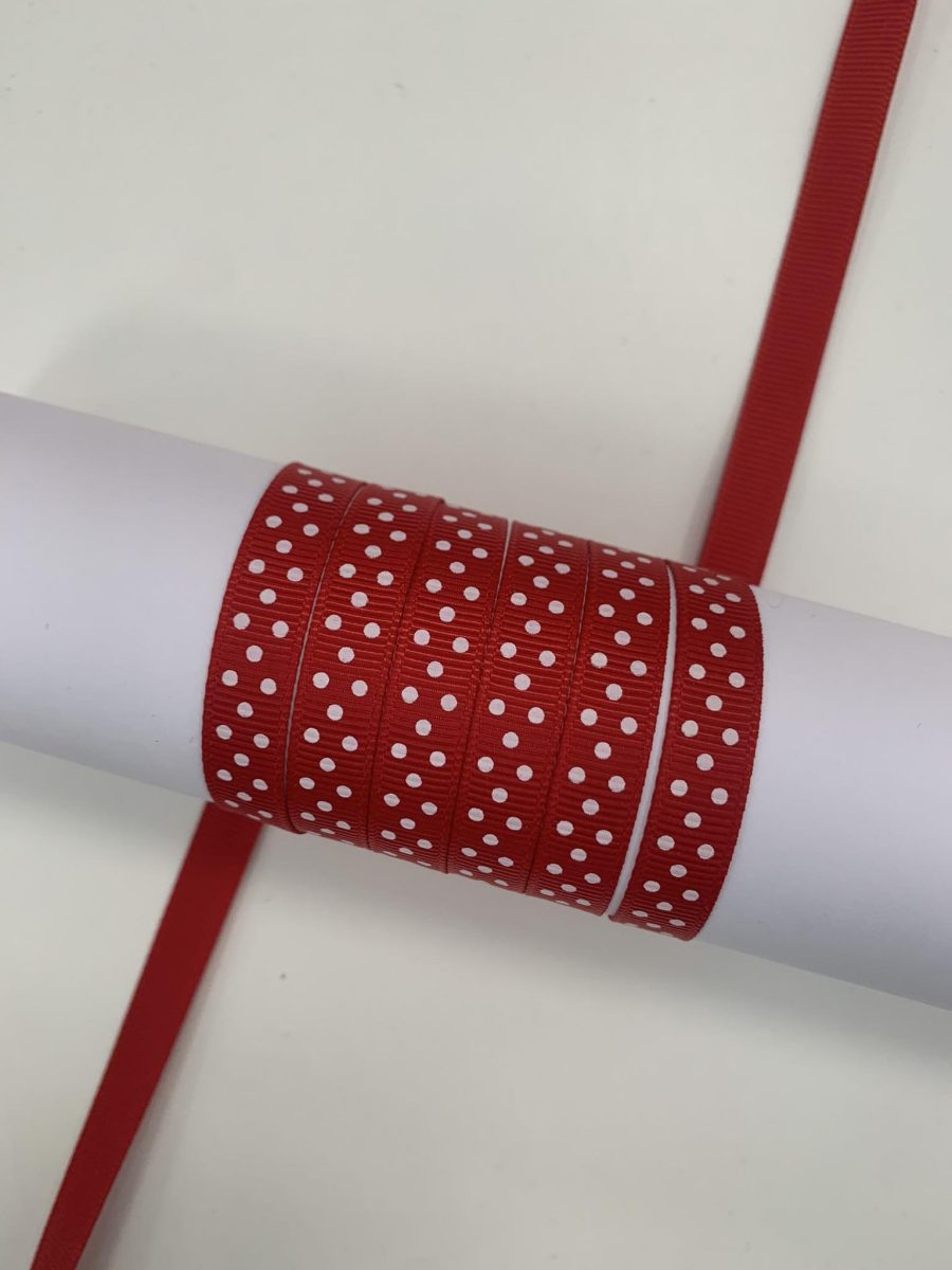 Grosgrain juostelė, 10 mm raudona su baltais taškeliais