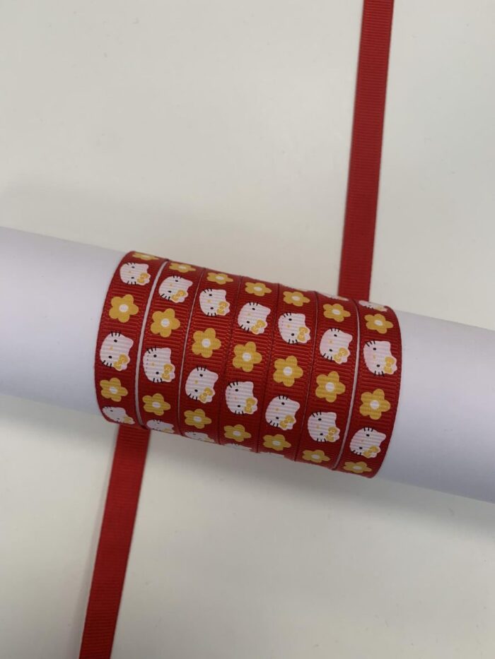 Grosgrain juostelė 10 mm, raudona su hello kitty