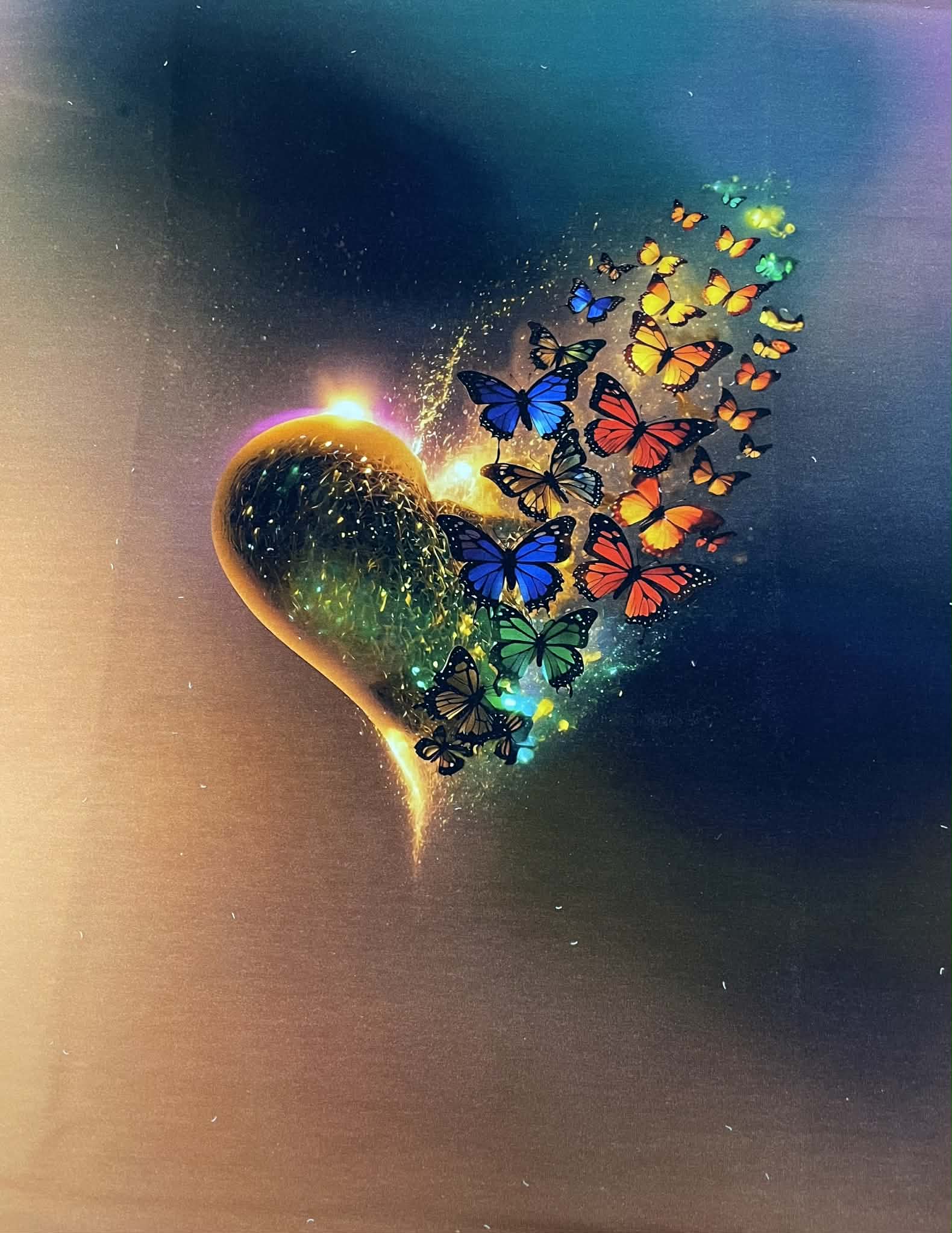 Kilpinio, skaitmeninės spaudos trikotažo panelė 60x70cm Širdelė su drugeliais – tai skaitmenine spauda margintos kilpinės medžiagos panelė/motyvas. Spalvota skaitmeninė spauda šiuo metu yra vienas iš moderniausių spausdinimo metodų ant tekstilės. Tai ekologiška spauda, nes jos gamybai naudojami skaitmeninei spaudai skirti vandeniniai dažai. Spauda ypatingai švelni ir kokybiška – neatsiranda vaizdo įtrūkimų net trikotažą stipriai ištempus, spalvos neišblunka bei tarnauja kelerius metus. Tuo pačiu skaitmeninė spauda ypatinga savo beribe spalvine gama ir akį traukiančiomis spalvomis. Paveiksliukai pasižymi nepriekaištinga raiška ir vaizdu, dėl naudojamų aukštos kokybės dažų piešinėliai nebijo atmosferos pokyčių (karščio, drėgmės) ir juos drąsiai galima skalbti. Pats kilpinis trikotažas – šiuo metu populiariausia ir dažniausiai naudojama trikotažo rūšis. Kilpinis trikotažas yra kokybiška, viengubo mezgimo medžiaga. Dėl savo elastingumo, malonumo, purumo ir paklusnumo siuvant šis audinys ypatingai tinka siūti laisvalaikio rūbams: sportiniams kostiumams, tunikoms, palaidinukėms, džemperiams, kelnėms, tamprėms, kepurėms, movoms ir pan. Kilpinis trikotažas yra neplonas, tvirtas ir kokybiškas, todėl tinka įvairių rūbų siuvimui ne tik suaugusiems, bet ir vaikams bei kūdikiams. Iš šios medžiagos pasiūti drabužiai malonūs dėvėti, patvarūs, paprastai skalbiami ir puikiai sugeriantys bei išgarinantys drėgmę, leidžiantys kūnui kvėpuoti.