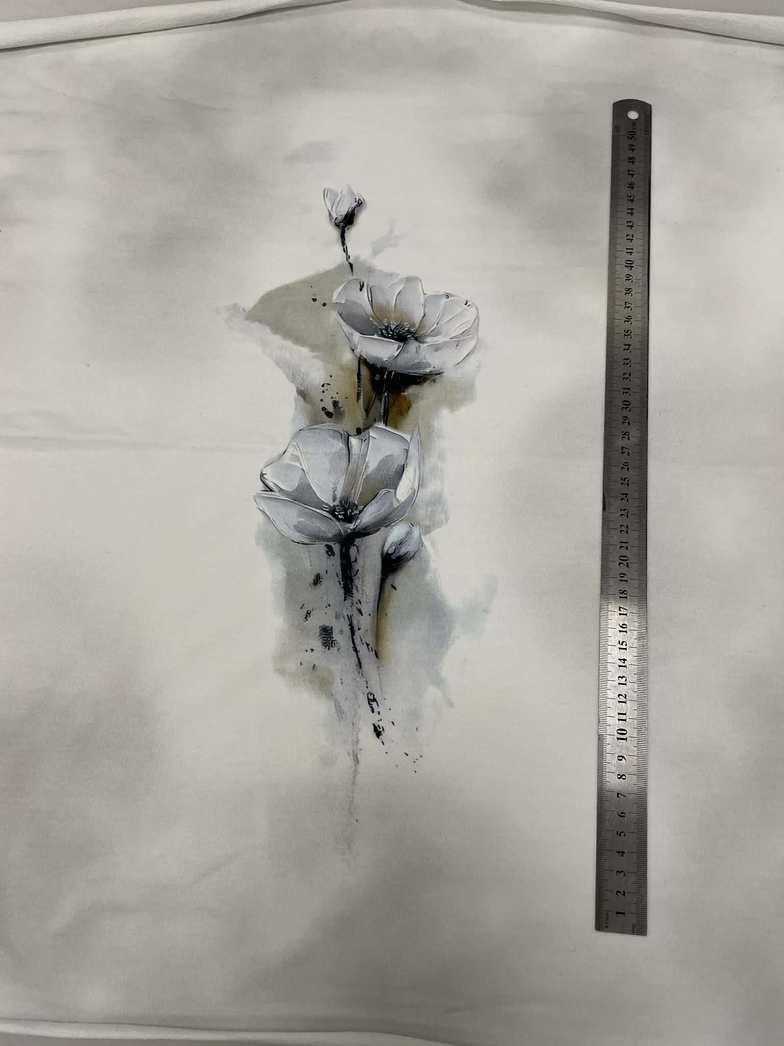 Kilpinio, skaitmeninės spaudos trikotažo panelė 60x70cm Tapyti žiedai – tai skaitmenine spauda margintos kilpinės medžiagos panelė/motyvas. Spalvota skaitmeninė spauda šiuo metu yra vienas iš moderniausių spausdinimo metodų ant tekstilės. Tai ekologiška spauda, nes jos gamybai naudojami skaitmeninei spaudai skirti vandeniniai dažai. Spauda ypatingai švelni ir kokybiška – neatsiranda vaizdo įtrūkimų net trikotažą stipriai ištempus, spalvos neišblunka bei tarnauja kelerius metus. Tuo pačiu skaitmeninė spauda ypatinga savo beribe spalvine gama ir akį traukiančiomis spalvomis. Paveiksliukai pasižymi nepriekaištinga raiška ir vaizdu, dėl naudojamų aukštos kokybės dažų piešinėliai nebijo atmosferos pokyčių (karščio, drėgmės) ir juos drąsiai galima skalbti. Pats kilpinis trikotažas – šiuo metu populiariausia ir dažniausiai naudojama trikotažo rūšis. Kilpinis trikotažas yra kokybiška, viengubo mezgimo medžiaga. Dėl savo elastingumo, malonumo, purumo ir paklusnumo siuvant šis audinys ypatingai tinka siūti laisvalaikio rūbams: sportiniams kostiumams, tunikoms, palaidinukėms, džemperiams, kelnėms, tamprėms, kepurėms, movoms ir pan. Kilpinis trikotažas yra neplonas, tvirtas ir kokybiškas, todėl tinka įvairių rūbų siuvimui ne tik suaugusiems, bet ir vaikams bei kūdikiams. Iš šios medžiagos pasiūti drabužiai malonūs dėvėti, patvarūs, paprastai skalbiami ir puikiai sugeriantys bei išgarinantys drėgmę, leidžiantys kūnui kvėpuoti.