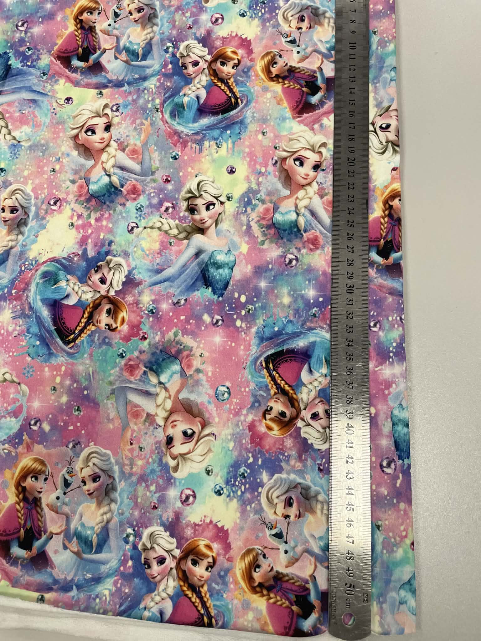 Kilpinis, skaitmeninės spaudos trikotažas Frozen – tai skaitmenine spauda marginta kilpinė medžiaga. Spalvota skaitmeninė spauda šiuo metu yra vienas iš moderniausių spausdinimo metodų ant tekstilės. Tai ekologiška spauda, nes jos gamybai naudojami skaitmeninei spaudai skirti vandeniniai dažai. Spauda ypatingai švelni ir kokybiška – neatsiranda vaizdo įtrūkimų net trikotažą stipriai ištempus, spalvos neišblunka bei tarnauja kelerius metus. Tuo pačiu skaitmeninė spauda ypatinga savo beribe spalvine gama ir akį traukiančiomis spalvomis. Paveiksliukai pasižymi nepriekaištinga raiška ir vaizdu, dėl naudojamų aukštos kokybės dažų piešinėliai nebijo atmosferos pokyčių (karščio, drėgmės) ir juos drąsiai galima skalbti. Pats kilpinis trikotažas – šiuo metu populiariausia ir dažniausiai naudojama trikotažo rūšis. Kilpinis trikotažas yra kokybiška, viengubo mezgimo medžiaga. Dėl savo elastingumo, malonumo, purumo ir paklusnumo siuvant šis audinys ypatingai tinka siūti laisvalaikio rūbams: sportiniams kostiumams, tunikoms, palaidinukėms, džemperiams, kelnėms, tamprėms, kepurėms, movoms ir pan. Kilpinis trikotažas yra neplonas, tvirtas ir kokybiškas, todėl tinka įvairių rūbų siuvimui ne tik suaugusiems, bet ir vaikams bei kūdikiams. Iš šios medžiagos pasiūti drabužiai malonūs dėvėti, patvarūs, paprastai skalbiami ir puikiai sugeriantys bei išgarinantys drėgmę, leidžiantys kūnui kvėpuoti. Pagrindinis medvilnės privalumas – higieniškumas, todėl puikiai tinka drabužiams, kurie tiesiogiai liečiasi su žmogaus kūnu.