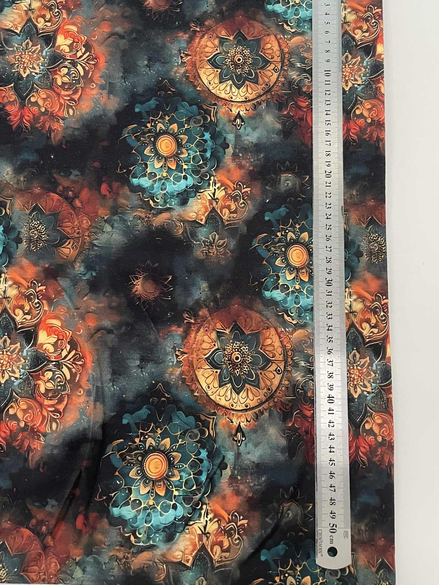 Kilpinis, skaitmeninės spaudos trikotažas Mandalos tamsiame fone – tai skaitmenine spauda marginta kilpinė medžiaga. Spalvota skaitmeninė spauda šiuo metu yra vienas iš moderniausių spausdinimo metodų ant tekstilės. Tai ekologiška spauda, nes jos gamybai naudojami skaitmeninei spaudai skirti vandeniniai dažai. Spauda ypatingai švelni ir kokybiška – neatsiranda vaizdo įtrūkimų net trikotažą stipriai ištempus, spalvos neišblunka bei tarnauja kelerius metus. Tuo pačiu skaitmeninė spauda ypatinga savo beribe spalvine gama ir akį traukiančiomis spalvomis. Paveiksliukai pasižymi nepriekaištinga raiška ir vaizdu, dėl naudojamų aukštos kokybės dažų piešinėliai nebijo atmosferos pokyčių (karščio, drėgmės) ir juos drąsiai galima skalbti. Pats kilpinis trikotažas – šiuo metu populiariausia ir dažniausiai naudojama trikotažo rūšis. Kilpinis trikotažas yra kokybiška, viengubo mezgimo medžiaga. Dėl savo elastingumo, malonumo, purumo ir paklusnumo siuvant šis audinys ypatingai tinka siūti laisvalaikio rūbams: sportiniams kostiumams, tunikoms, palaidinukėms, džemperiams, kelnėms, tamprėms, kepurėms, movoms ir pan. Kilpinis trikotažas yra neplonas, tvirtas ir kokybiškas, todėl tinka įvairių rūbų siuvimui ne tik suaugusiems, bet ir vaikams bei kūdikiams. Iš šios medžiagos pasiūti drabužiai malonūs dėvėti, patvarūs, paprastai skalbiami ir puikiai sugeriantys bei išgarinantys drėgmę, leidžiantys kūnui kvėpuoti. Pagrindinis medvilnės privalumas – higieniškumas, todėl puikiai tinka drabužiams, kurie tiesiogiai liečiasi su žmogaus kūnu.