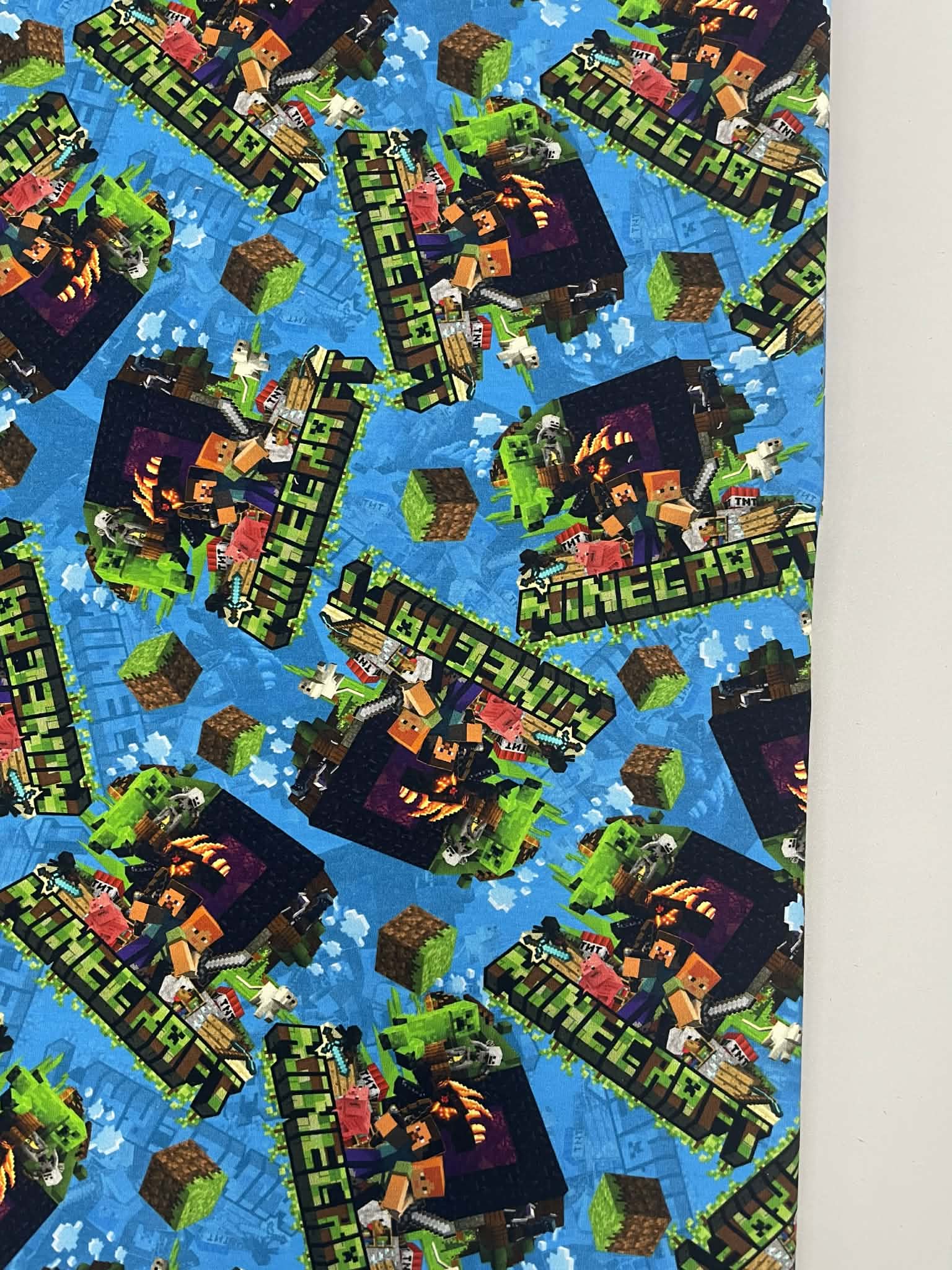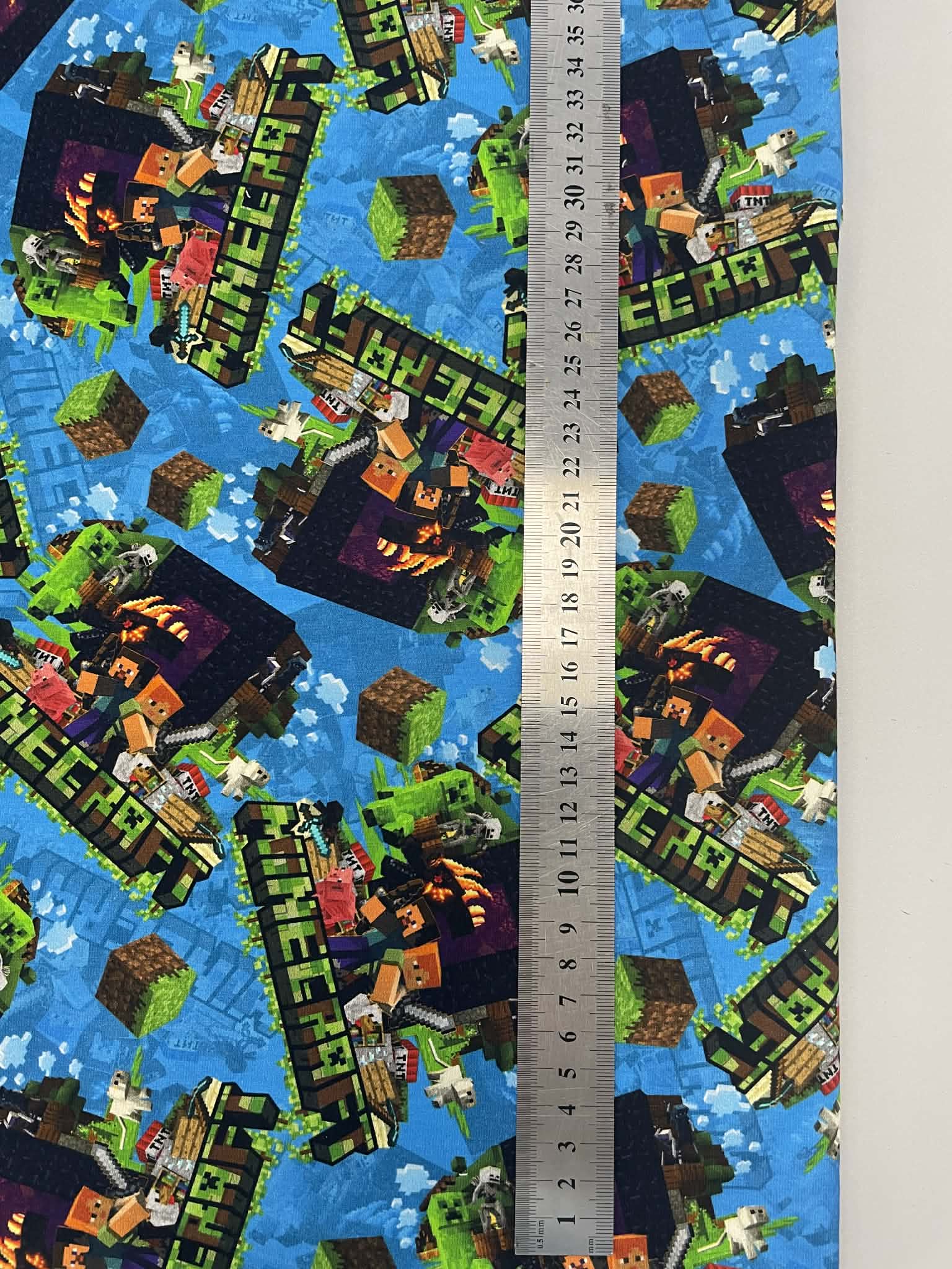 Kilpinis, skaitmeninės spaudos trikotažas Minecraft mėlynam fone- tai skaitmenine spauda marginta kilpinė medžiaga. Spalvota skaitmeninė spauda šiuo metu yra vienas iš moderniausių spausdinimo metodų ant tekstilės. Tai ekologiška spauda, nes jos gamybai naudojami skaitmeninei spaudai skirti vandeniniai dažai. Spauda ypatingai švelni ir kokybiška – neatsiranda vaizdo įtrūkimų net trikotažą stipriai ištempus, spalvos neišblunka bei tarnauja kelerius metus. Tuo pačiu skaitmeninė spauda ypatinga savo beribe spalvine gama ir akį traukiančiomis spalvomis. Paveiksliukai pasižymi nepriekaištinga raiška ir vaizdu, dėl naudojamų aukštos kokybės dažų piešinėliai nebijo atmosferos pokyčių (karščio, drėgmės) ir juos drąsiai galima skalbti. Pats kilpinis trikotažas – šiuo metu populiariausia ir dažniausiai naudojama trikotažo rūšis. Kilpinis trikotažas yra kokybiška, viengubo mezgimo medžiaga. Dėl savo elastingumo, malonumo, purumo ir paklusnumo siuvant šis audinys ypatingai tinka siūti laisvalaikio rūbams: sportiniams kostiumams, tunikoms, palaidinukėms, džemperiams, kelnėms, tamprėms, kepurėms, movoms ir pan. Kilpinis trikotažas yra neplonas, tvirtas ir kokybiškas, todėl tinka įvairių rūbų siuvimui ne tik suaugusiems, bet ir vaikams bei kūdikiams. Iš šios medžiagos pasiūti drabužiai malonūs dėvėti, patvarūs, paprastai skalbiami ir puikiai sugeriantys bei išgarinantys drėgmę, leidžiantys kūnui kvėpuoti. Pagrindinis medvilnės privalumas – higieniškumas, todėl puikiai tinka drabužiams, kurie tiesiogiai liečiasi su žmogaus kūnu.