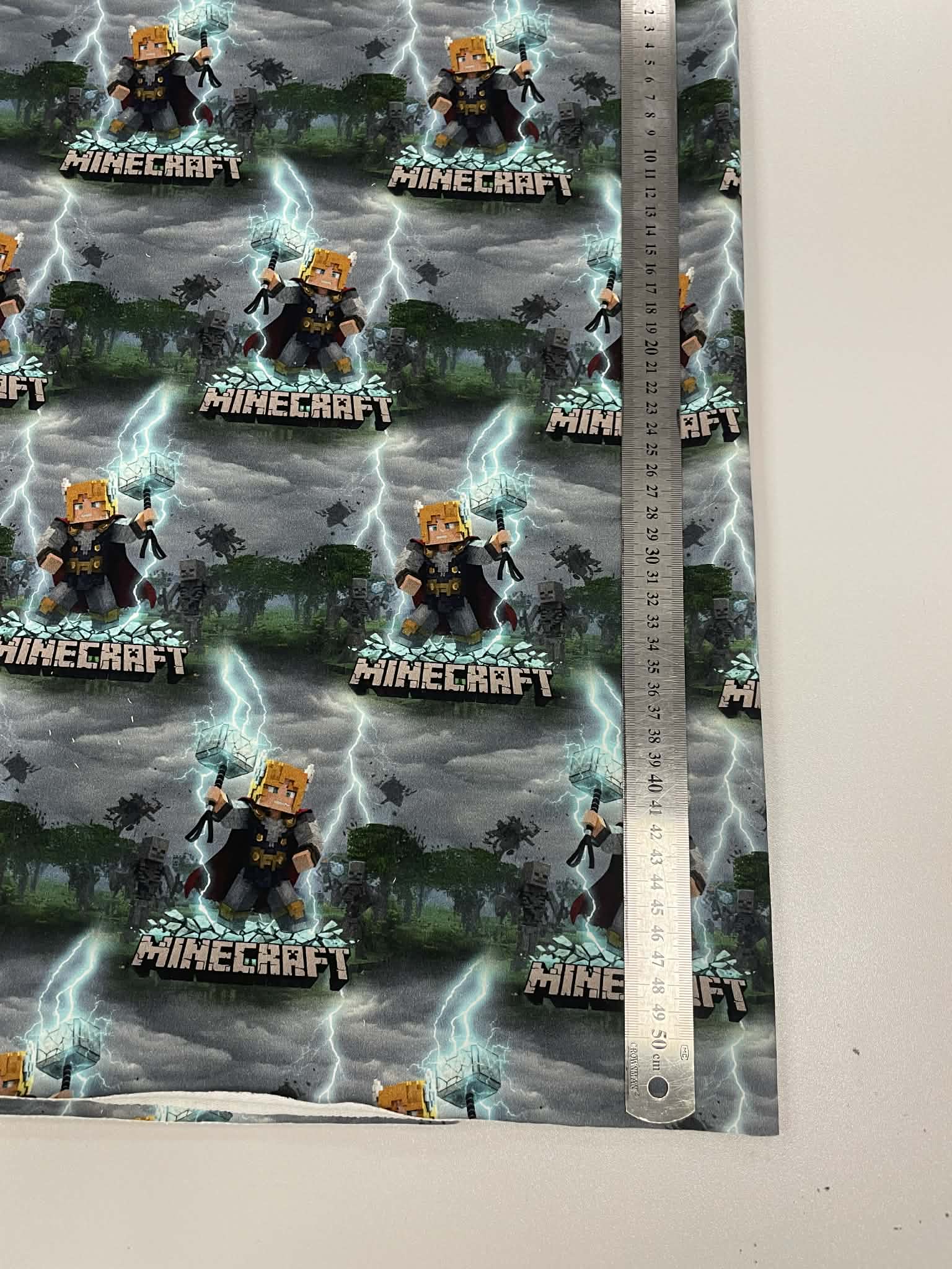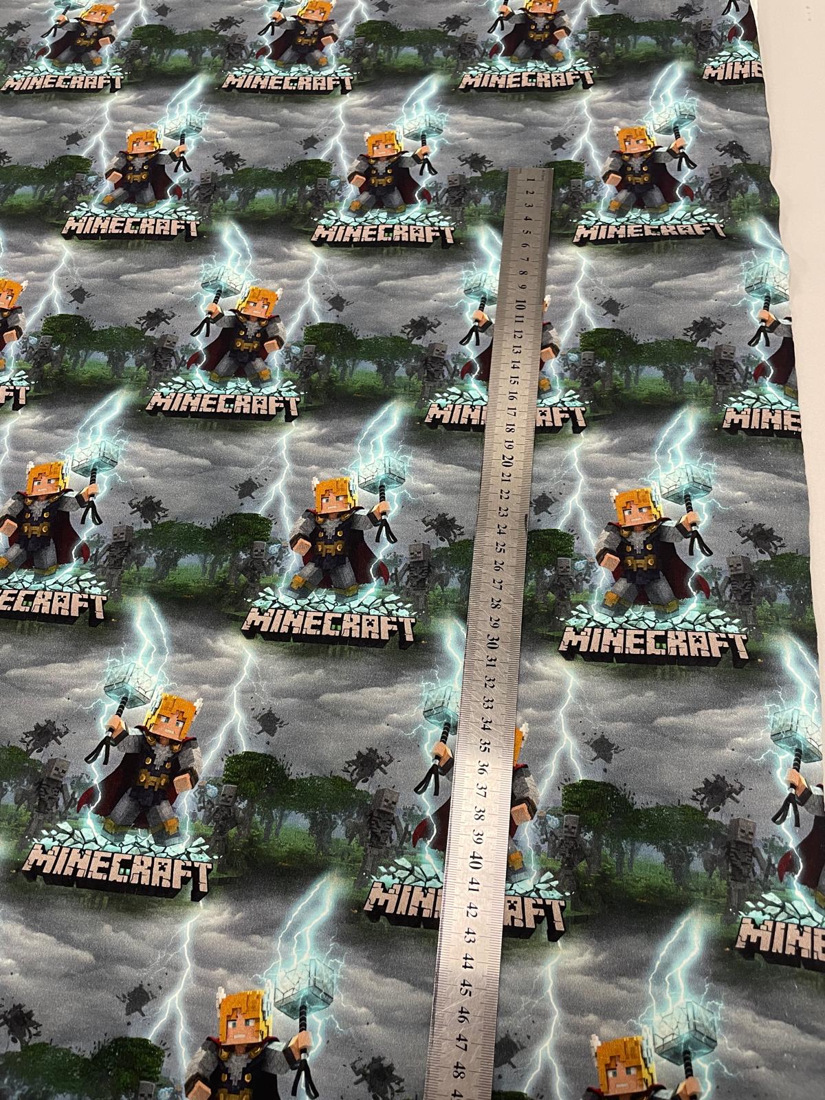 Kilpinis, skaitmeninės spaudos trikotažas Minecraft pilkas fonas – tai skaitmenine spauda marginta kilpinė medžiaga. Spalvota skaitmeninė spauda šiuo metu yra vienas iš moderniausių spausdinimo metodų ant tekstilės. Tai ekologiška spauda, nes jos gamybai naudojami skaitmeninei spaudai skirti vandeniniai dažai. Spauda ypatingai švelni ir kokybiška – neatsiranda vaizdo įtrūkimų net trikotažą stipriai ištempus, spalvos neišblunka bei tarnauja kelerius metus. Tuo pačiu skaitmeninė spauda ypatinga savo beribe spalvine gama ir akį traukiančiomis spalvomis. Paveiksliukai pasižymi nepriekaištinga raiška ir vaizdu, dėl naudojamų aukštos kokybės dažų piešinėliai nebijo atmosferos pokyčių (karščio, drėgmės) ir juos drąsiai galima skalbti. Pats kilpinis trikotažas – šiuo metu populiariausia ir dažniausiai naudojama trikotažo rūšis. Kilpinis trikotažas yra kokybiška, viengubo mezgimo medžiaga. Dėl savo elastingumo, malonumo, purumo ir paklusnumo siuvant šis audinys ypatingai tinka siūti laisvalaikio rūbams: sportiniams kostiumams, tunikoms, palaidinukėms, džemperiams, kelnėms, tamprėms, kepurėms, movoms ir pan. Kilpinis trikotažas yra neplonas, tvirtas ir kokybiškas, todėl tinka įvairių rūbų siuvimui ne tik suaugusiems, bet ir vaikams bei kūdikiams. Iš šios medžiagos pasiūti drabužiai malonūs dėvėti, patvarūs, paprastai skalbiami ir puikiai sugeriantys bei išgarinantys drėgmę, leidžiantys kūnui kvėpuoti. Pagrindinis medvilnės privalumas – higieniškumas, todėl puikiai tinka drabužiams, kurie tiesiogiai liečiasi su žmogaus kūnu.