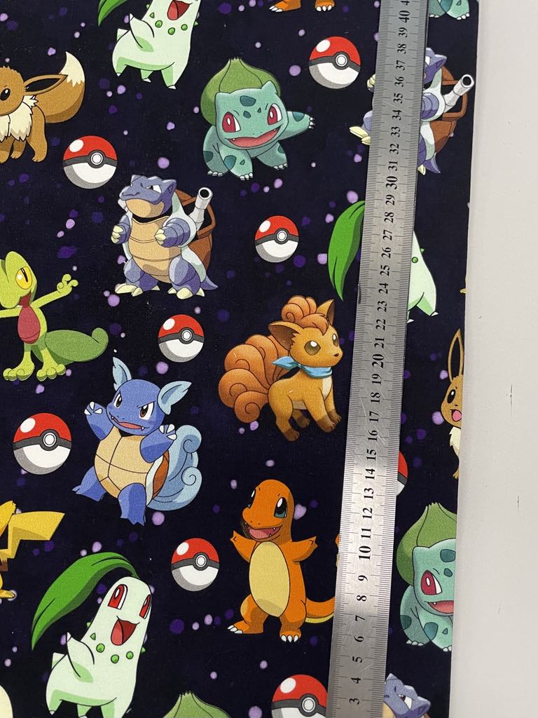 Kilpinis, skaitmeninės spaudos trikotažas Pokemonai – tai skaitmenine spauda marginta kilpinė medžiaga. Spalvota skaitmeninė spauda šiuo metu yra vienas iš moderniausių spausdinimo metodų ant tekstilės. Tai ekologiška spauda, nes jos gamybai naudojami skaitmeninei spaudai skirti vandeniniai dažai. Spauda ypatingai švelni ir kokybiška – neatsiranda vaizdo įtrūkimų net trikotažą stipriai ištempus, spalvos neišblunka bei tarnauja kelerius metus. Tuo pačiu skaitmeninė spauda ypatinga savo beribe spalvine gama ir akį traukiančiomis spalvomis. Paveiksliukai pasižymi nepriekaištinga raiška ir vaizdu, dėl naudojamų aukštos kokybės dažų piešinėliai nebijo atmosferos pokyčių (karščio, drėgmės) ir juos drąsiai galima skalbti. Pats kilpinis trikotažas – šiuo metu populiariausia ir dažniausiai naudojama trikotažo rūšis. Kilpinis trikotažas yra kokybiška, viengubo mezgimo medžiaga. Dėl savo elastingumo, malonumo, purumo ir paklusnumo siuvant šis audinys ypatingai tinka siūti laisvalaikio rūbams: sportiniams kostiumams, tunikoms, palaidinukėms, džemperiams, kelnėms, tamprėms, kepurėms, movoms ir pan. Kilpinis trikotažas yra neplonas, tvirtas ir kokybiškas, todėl tinka įvairių rūbų siuvimui ne tik suaugusiems, bet ir vaikams bei kūdikiams. Iš šios medžiagos pasiūti drabužiai malonūs dėvėti, patvarūs, paprastai skalbiami ir puikiai sugeriantys bei išgarinantys drėgmę, leidžiantys kūnui kvėpuoti. Pagrindinis medvilnės privalumas – higieniškumas, todėl puikiai tinka drabužiams, kurie tiesiogiai liečiasi su žmogaus kūnu.