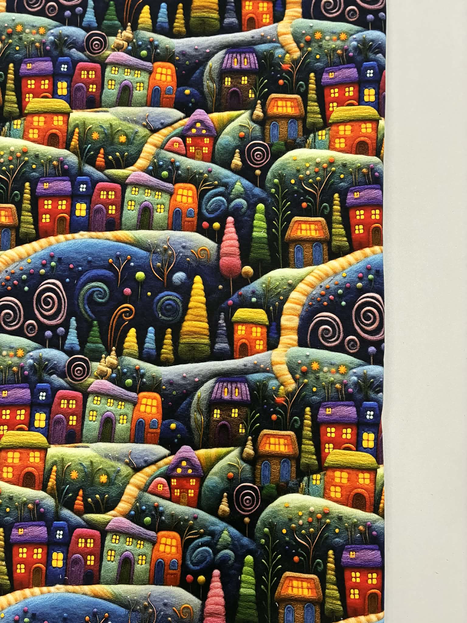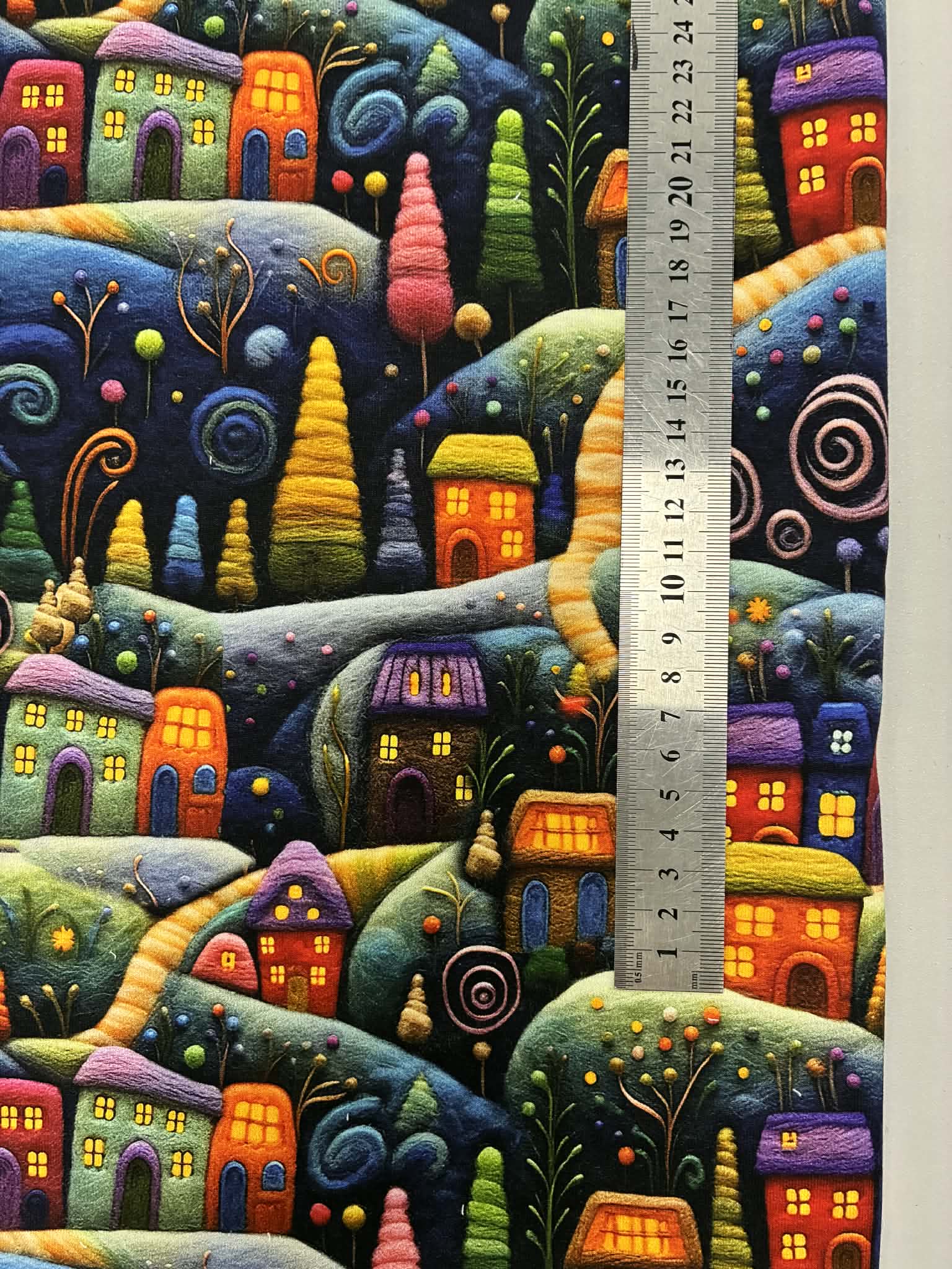 Kilpinis, skaitmeninės spaudos trikotažas Spalvoti namukai- tai skaitmenine spauda marginta kilpinė medžiaga. Spalvota skaitmeninė spauda šiuo metu yra vienas iš moderniausių spausdinimo metodų ant tekstilės. Tai ekologiška spauda, nes jos gamybai naudojami skaitmeninei spaudai skirti vandeniniai dažai. Spauda ypatingai švelni ir kokybiška – neatsiranda vaizdo įtrūkimų net trikotažą stipriai ištempus, spalvos neišblunka bei tarnauja kelerius metus. Tuo pačiu skaitmeninė spauda ypatinga savo beribe spalvine gama ir akį traukiančiomis spalvomis. Paveiksliukai pasižymi nepriekaištinga raiška ir vaizdu, dėl naudojamų aukštos kokybės dažų piešinėliai nebijo atmosferos pokyčių (karščio, drėgmės) ir juos drąsiai galima skalbti. Pats kilpinis trikotažas – šiuo metu populiariausia ir dažniausiai naudojama trikotažo rūšis. Kilpinis trikotažas yra kokybiška, viengubo mezgimo medžiaga. Dėl savo elastingumo, malonumo, purumo ir paklusnumo siuvant šis audinys ypatingai tinka siūti laisvalaikio rūbams: sportiniams kostiumams, tunikoms, palaidinukėms, džemperiams, kelnėms, tamprėms, kepurėms, movoms ir pan. Kilpinis trikotažas yra neplonas, tvirtas ir kokybiškas, todėl tinka įvairių rūbų siuvimui ne tik suaugusiems, bet ir vaikams bei kūdikiams. Iš šios medžiagos pasiūti drabužiai malonūs dėvėti, patvarūs, paprastai skalbiami ir puikiai sugeriantys bei išgarinantys drėgmę, leidžiantys kūnui kvėpuoti. Pagrindinis medvilnės privalumas – higieniškumas, todėl puikiai tinka drabužiams, kurie tiesiogiai liečiasi su žmogaus kūnu.
