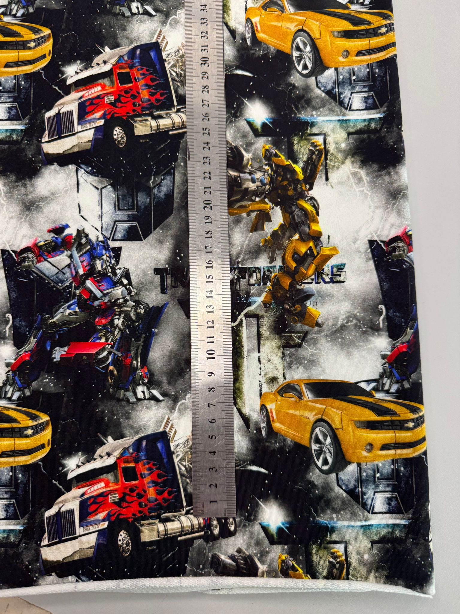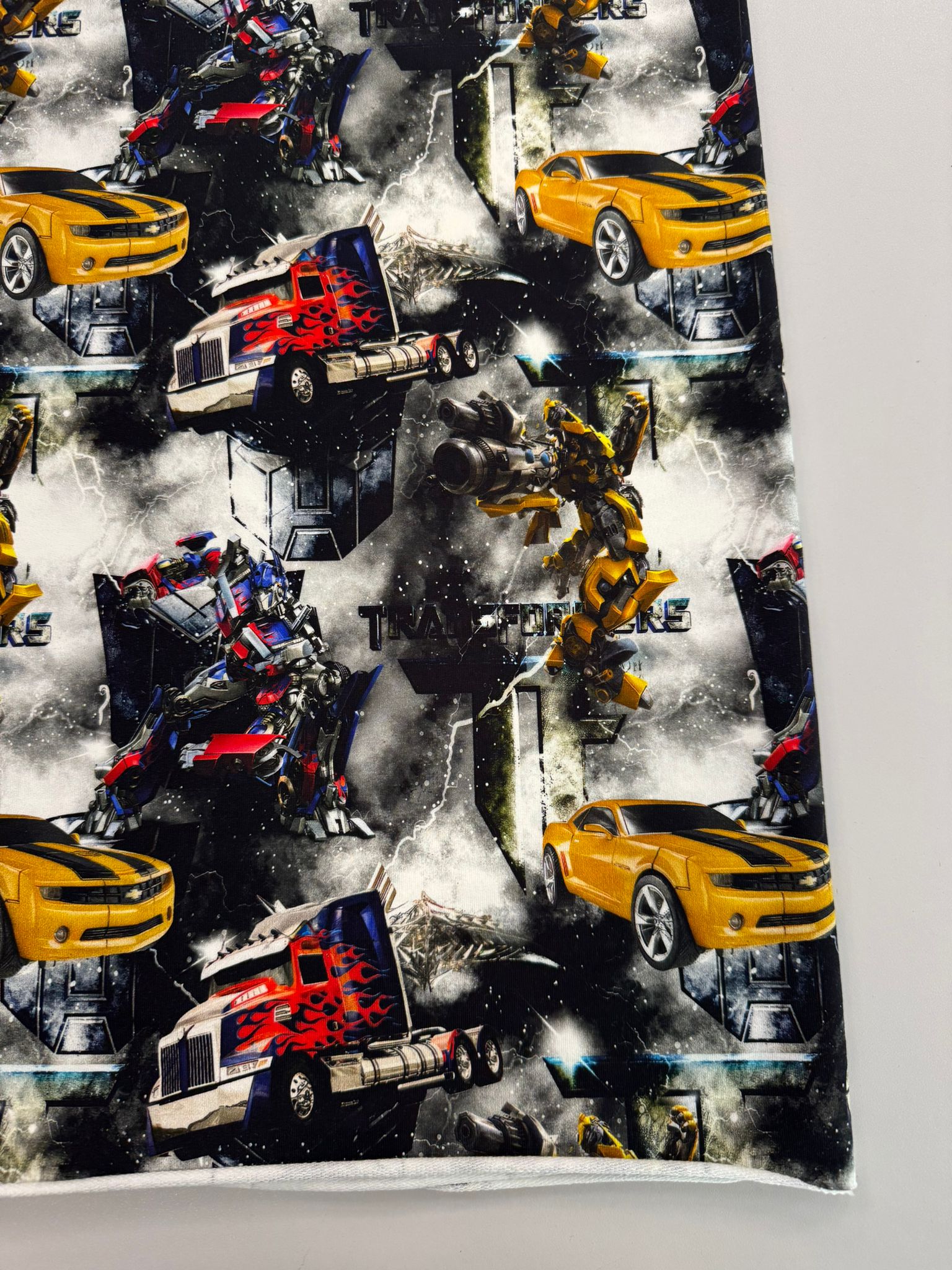 Kilpinis, skaitmeninės spaudos trikotažas Transformeriai –  tai skaitmenine spauda marginta kilpinė medžiaga. Spalvota skaitmeninė spauda šiuo metu yra vienas iš moderniausių spausdinimo metodų ant tekstilės. Tai ekologiška spauda, nes jos gamybai naudojami skaitmeninei spaudai skirti vandeniniai dažai. Spauda ypatingai švelni ir kokybiška – neatsiranda vaizdo įtrūkimų net trikotažą stipriai ištempus, spalvos neišblunka bei tarnauja kelerius metus. Tuo pačiu skaitmeninė spauda ypatinga savo beribe spalvine gama ir akį traukiančiomis spalvomis. Paveiksliukai pasižymi nepriekaištinga raiška ir vaizdu, dėl naudojamų aukštos kokybės dažų piešinėliai nebijo atmosferos pokyčių (karščio, drėgmės) ir juos drąsiai galima skalbti. Pats kilpinis trikotažas – šiuo metu populiariausia ir dažniausiai naudojama trikotažo rūšis. Kilpinis trikotažas yra kokybiška, viengubo mezgimo medžiaga. Dėl savo elastingumo, malonumo, purumo ir paklusnumo siuvant šis audinys ypatingai tinka siūti laisvalaikio rūbams: sportiniams kostiumams, tunikoms, palaidinukėms, džemperiams, kelnėms, tamprėms, kepurėms, movoms ir pan. Kilpinis trikotažas yra neplonas, tvirtas ir kokybiškas, todėl tinka įvairių rūbų siuvimui ne tik suaugusiems, bet ir vaikams bei kūdikiams. Iš šios medžiagos pasiūti drabužiai malonūs dėvėti, patvarūs, paprastai skalbiami ir puikiai sugeriantys bei išgarinantys drėgmę, leidžiantys kūnui kvėpuoti. Pagrindinis medvilnės privalumas – higieniškumas, todėl puikiai tinka drabužiams, kurie tiesiogiai liečiasi su žmogaus kūnu.