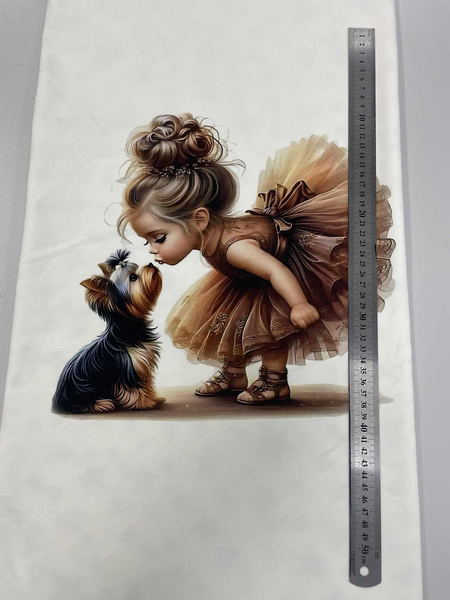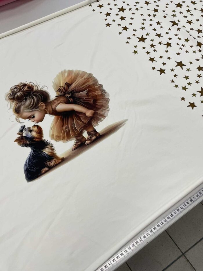 Kilpinis, skaitmeninės spaudos trikotažo fragmentas, Mergaitė su šuniuku