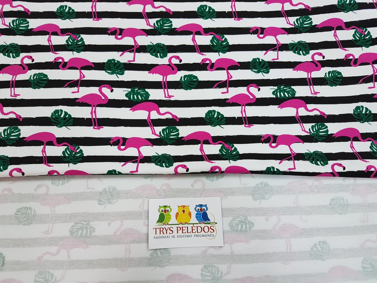 Kilpinis trikotažas Flamingai. Kilpinis trikotažas – šiuo metu populiariausia ir dažniausiai naudojama trikotažo rūšis. Kilpinis trikotažas yra kokybiška, viengubo mezgimo medžiaga. Dėl savo elastingumo, malonumo, purumo ir paklusnumo siuvant šis audinys ypatingai tinka siūti laisvalaikio rūbams: sportinimas kostiumams, tunikoms, palaidinukėms, kelnėms, kepurėms, movoms ir pan. Kilpinis trikotažas yra tvirtas, sertifikuotas ir kokybiškas, todėl tinka įvairių rūbų siuvimui ne tik suaugusiems, bet ir vaikams. Iš šios medžiagos pasiūti drabužiai malonūs dėvėti, patvarūs, paprastai skalbiami ir puikiai sugeriantys bei išgarinantys drėgmę. Pagrindinis medvilnės privalumas – higieniškumas, todėl puikiai tinka drabužiams, kurie tiesiogiai liečiasi su žmogaus kūnu. Medžiaga labai praktiška, nereikalauja ypatingos priežiūros. Net ir dažnai skalbiant, bet tinkamai naudojant ir prižiūrint ši medžiaga ilgai išlaikys pradinę spalvą, formą ir išliks kokybiška. Nors medvilnė yra tvirta ir atspari skalbimui, rekomenduojame gręžti kuo mažiausiomis apsukomis, kad nesusimestų sunkiai išlyginamų raukšlių. Kilpinis trikotažas Flamingai – tai ryškūs flamingaii, marginti ant dryžuoto pagrindo.