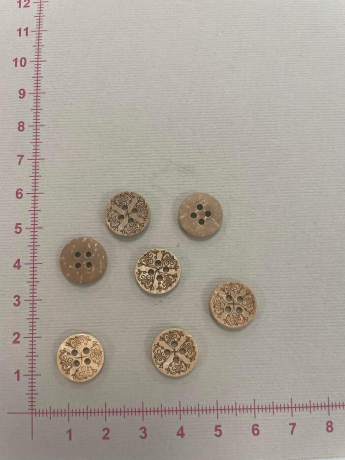Medinė saga su ornamentais. Saga – tai viena iš pagrindinių rūbo užsegimo priemonių. Šiais laikas sagos yra labai svarbi detalė mūsų drabužiuose, nes dažniai jos jau atlieka ne tik užsegimo fuknkciją, bet tampa ir išskirtiniu akcentu, padailina rūbą, suteikia jam išskirtinumo, individualumo ir žaismingumo. Išskirtinė, arba net ir paprasta saga suteikia kiekvienam rūbui savą charakterį ir stilių. Sagos būna įvairių įvairiausios: skiriasi sagų dydžiai, formos, spalvos. Sagos būna išskirtinai vaikiškos, skirtos tik suaugusiems arba universalios, tinkančios tiek mažiesiems nenaudėliams, tiek paaugliams, vyrams ir moterims. Sagų spalvų paletė pati įvairiausia: nuo natūralių medinių iki vienspalvių ar margų, su unikaliais ir išskirtiniais piešinėliais ar raižiniais. Dažniausiai sagų spalva derinama prie siuvamo ar mezgamo rūbo. Paprastos plastikinės sagos yra patvarios ir labai praktiškos. Medinės sagos rūbui ar mezginiui suteikia išskirtinumo ir natūralumo pojūtį. Kokosinės sagos yra puikus variantas ieškantiems lengvų, įdomių sagų. Medinė saga su ornamentais – tai natūralaus kokoso medžio saga, natūraliai nulakuota ir išdeginta įvairiais ornamentais, prisiuvimui yra 4 skylutės, jos skersmuo – 12 mm. Saga universali, tinkama tiek vaikiškiems, tiek suaugusiųjų rūbams dekoruoti.