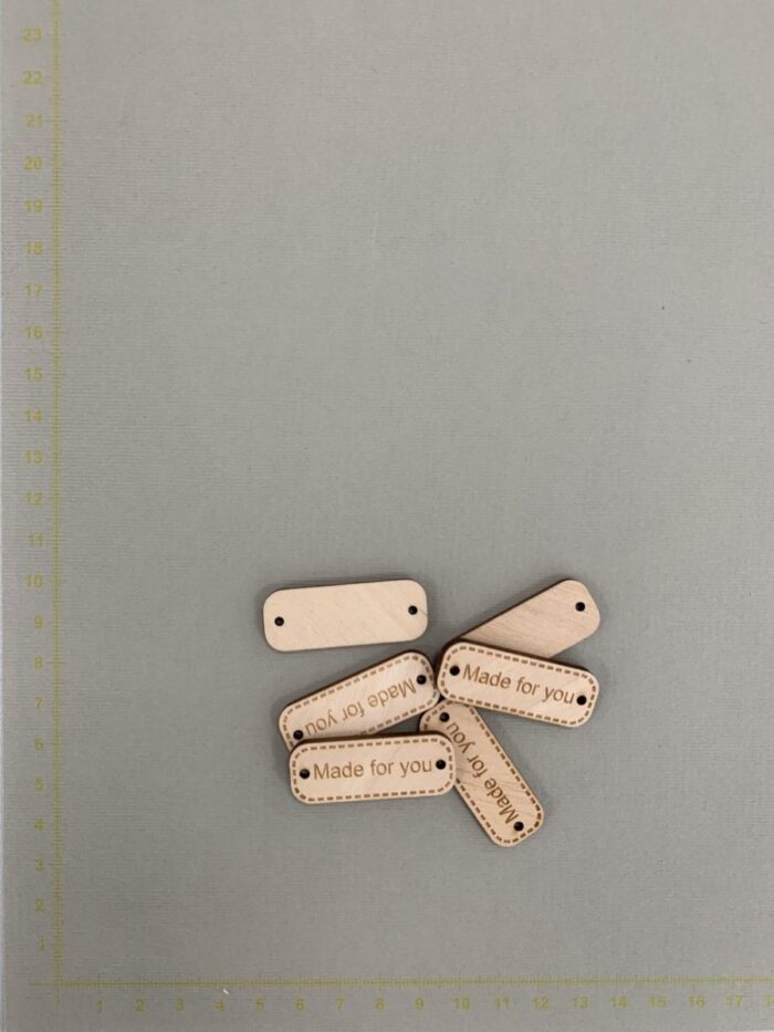 Medinė etiketė Made for you, didelė – tai kokybiška, prabangi, ir daug teigiamų emocijų skleidžianti medinė etiketė. Medinės etiketės dažniausiai naudojamos siuvimo pramonėje, norint pasiūtam rūbui suteikti orginalumo, išskirtinumo. Galima šias etiketes naudoti drabužio ar kito gaminio viduje, mažiau matomoje vietoje, tačiau jas puikiai galite tvirtinti ir išorinėje rūbo vietoje. Ši etiketė yra pagaminta iš natūralios medienos, užrašas išdegintas., todėl suteiks Jūsų pagamintam rūbui natūralumo, tuo pačiu tai bus įrodymas, kad rūbas pagamintas rankomis. Etiketė ypatinga tuo, kad yra labai lengva, pagaminta kokybiškai, neblunka, atsparios skalbimui, yra ilgaamžės. Šios etiketės pritvirtinimas labai paprastas ir patogus: etiketės kraštuose yra nedidelės skylutės, jas puikiai galima prisiūti paprasta siuvimo adata. Etiketė lengva, todėl tikrai nesvers ir netemps net ir pačio lengviausio audinio. Užrašas Made for you (angl.) reiškia “Pagaminta Tau”. Etiketė skirta kiekvienos siuvėjos ir rūbo dėvėtojo pasididžiavimui!