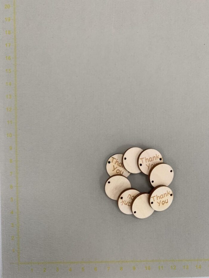 Medinė etiketė Thank you, maža – tai kokybiška, prabangi, ir daug teigiamų emocijų skleidžianti medinė etiketė. Medinės etiketės dažniausiai naudojamos siuvimo pramonėje, norint pasiūtam rūbui suteikti orginalumo, išskirtinumo. Galima šias etiketes naudoti drabužio ar kito gaminio viduje, mažiau matomoje vietoje, tačiau jas puikiai galite tvirtinti ir išorinėje rūbo vietoje. Ši etiketė yra pagaminta iš natūralios medienos, užrašas išdegintas, todėl suteiks Jūsų pagamintam rūbui natūralumo, tuo pačiu tai bus įrodymas, kad rūbas tikrai pagamintas rankomis. Etiketė ypatinga tuo, kad yra labai lengva, pagaminta kokybiškai, neblunka, atspari skalbimui, yra ilgaamžė. Šios etiketės pritvirtinimas labai paprastas ir patogus: etiketės kraštuose yra nedidelės skylutės, jas puikiai galima prisiūti paprasta siuvimo adata. Etiketė lengva, todėl tikrai nesvers ir netemps net ir pačio lengviausio audinio. Užrašas Thank you (angl.) reiškia “Ačiū”. Etiketė skirta kiekvienos siuvėjos ir rūbo dėvėtojo pasididžiavimui!