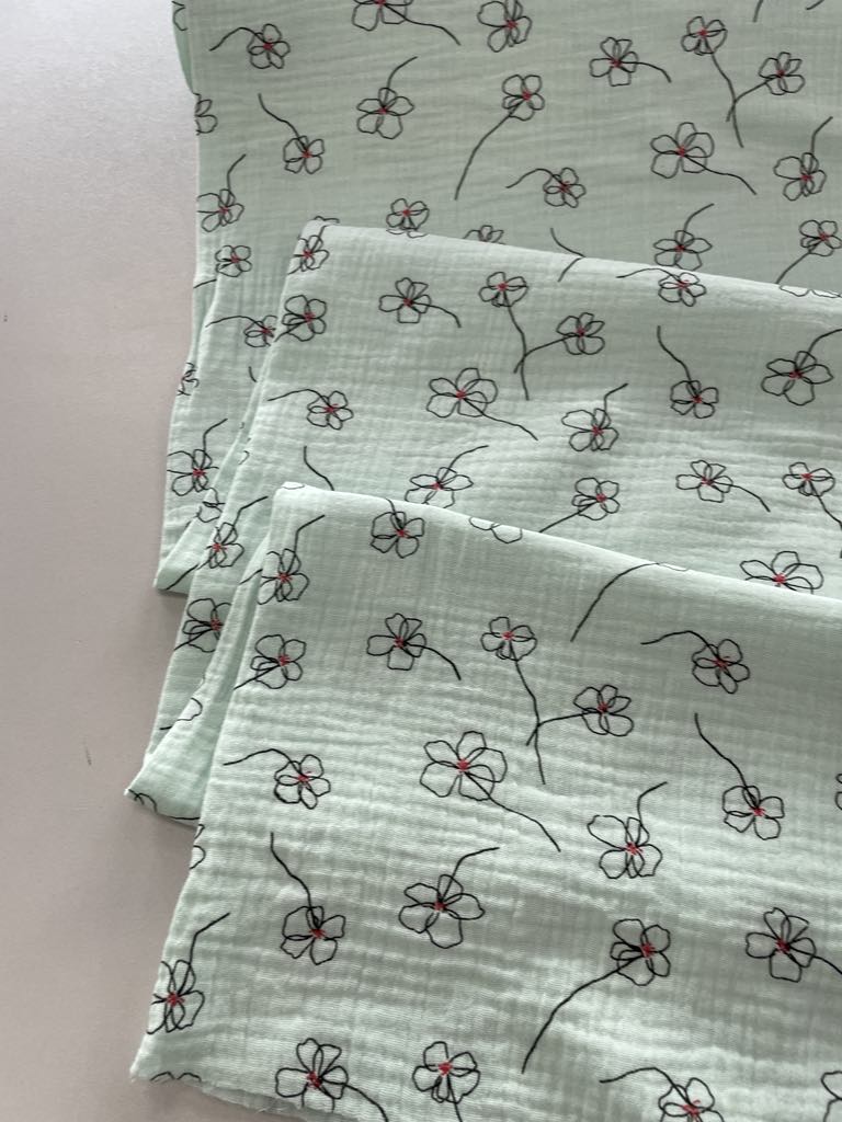 Medvilninis double gauze muslinas Gėlytės mėtinis– muslinas tai reto audimo medžiaga, kurios abi pusės gali būti naudojamos kaip gerosios. Medvilnė puikiai sugeria drėgmę, nesielektrina, todėl yra tinkama drabužiams, skiautiniams, namų tekstilei, patalynei, užuolaidoms, rankdarbiams ir kt. Audinys neturi elastano, nesitampo. Tai reikėtų įvertinti prieš apskaičiuojant, kiek audinio Jums reikės. Šis audinys yra tvirtas, kokybiškas, todėl tinka įvairių rūbų siuvimui ne tik suaugusiems, bet ir vaikams. Iš šios medžiagos pasiūti drabužiai malonūs dėvėti, patvarūs, paprastai skalbiami ir puikiai sugeriantys bei išgarinantys drėgmę, leidžiantys kūnui kvėpuoti. Pagrindinis medvilnės privalumas – higieniškumas, todėl puikiai tinka drabužiams, kurie tiesiogiai liečiasi su žmogaus kūnu. Medžiaga labai praktiška, nereikalauja ypatingos priežiūros. Net ir dažnai skalbiant, bet tinkamai naudojant ir prižiūrint ši medžiaga ilgai išlaikys pradinę spalvą, formą ir išliks kokybiška.