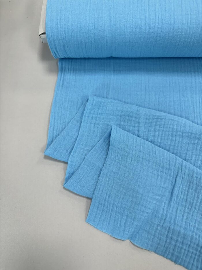 Medvilninis double gauze muslinas Šviesiai mėlyna– muslinas tai reto audimo medžiaga, kurios abi pusės gali būti naudojamos kaip gerosios. Medvilnė puikiai sugeria drėgmę, nesielektrina, todėl yra tinkama drabužiams, skiautiniams, namų tekstilei, patalynei, užuolaidoms, rankdarbiams ir kt. Audinys neturi elastano, nesitampo. Tai reikėtų įvertinti prieš apskaičiuojant, kiek audinio Jums reikės. Šis audinys yra tvirtas, kokybiškas, todėl tinka įvairių rūbų siuvimui ne tik suaugusiems, bet ir vaikams. Iš šios medžiagos pasiūti drabužiai malonūs dėvėti, patvarūs, paprastai skalbiami ir puikiai sugeriantys bei išgarinantys drėgmę, leidžiantys kūnui kvėpuoti. Pagrindinis medvilnės privalumas – higieniškumas, todėl puikiai tinka drabužiams, kurie tiesiogiai liečiasi su žmogaus kūnu. Medžiaga labai praktiška, nereikalauja ypatingos priežiūros. Net ir dažnai skalbiant, bet tinkamai naudojant ir prižiūrint ši medžiaga ilgai išlaikys pradinę spalvą, formą ir išliks kokybiška.