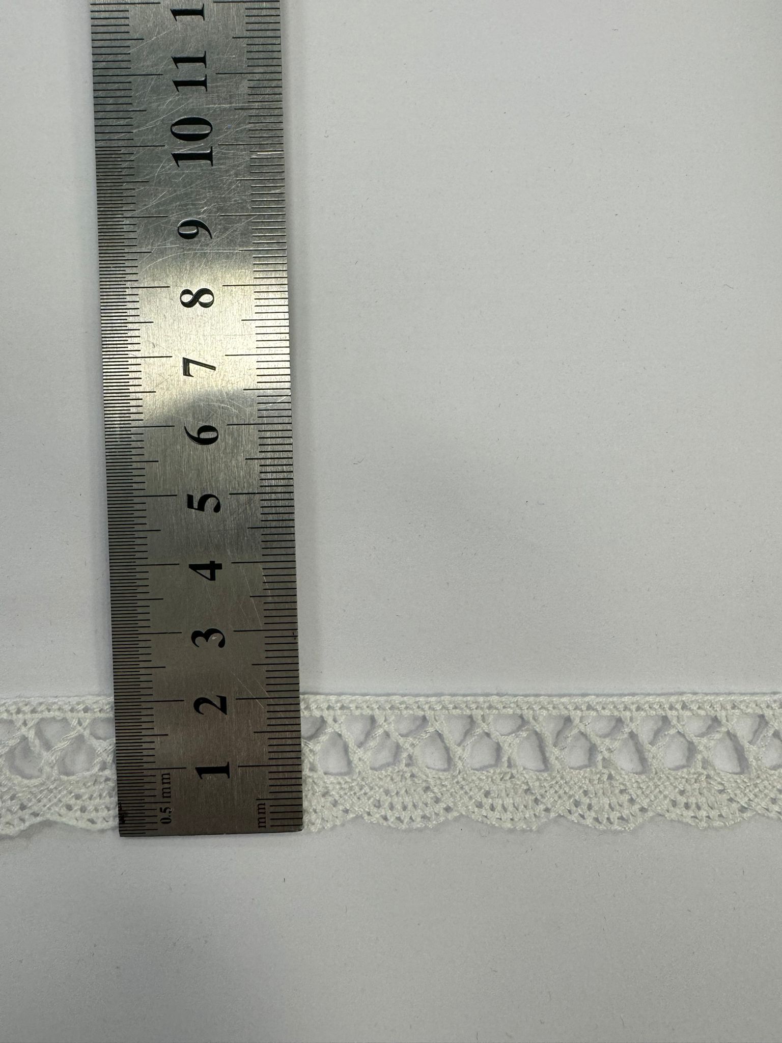 Medvilninis nėrinys, 22 mm,pieno baltumo. Medvilniniai nėrinukai yra pastelinių spalvų, įvairių pločių. Medvilninis nėrinukas dažniausiai naudojamas viršutinių rūbų (suknelių, sijonų, palaidinukių, glaustinukių) apatinių bei naktinių drabužių dekoravimui. Medvilninis nėrinukas dekoruojamam rūbui suteikia elegantiškumo bei išskirtinumo. Kiekviena detalė su medvilniniu nėrinuku suteikia seksualumo, apgaubia paslaptingumo skraiste, suteikia orginalumo, seksualumo ir pasitikėjimo savimi. Medvilninis nėrinukai būna marginti įvairiomis formomis, gėlėmis ar šiaip raštais. Šie medvilniniai nėrinukai dažnai naudojami ir rankdarbiams: jais dekoruojami namų apyvokos daiktai, tokie kaip pagalvėlės, servetėlės, staltiesės ir pan., tai gali būti dekoracijos vestuvėms ar krikštynoms. Galima iškarpyti nėrinuko detales ir naudoti įvairiems rankdarbiams ar dekoravimui. Nėrinukus galima derinti su viskoziniu, sintetiniu, plonos ar storos medvilnės trikotažu. Juoselė nėra tampri, matuojama metrais. Priderinkite nėrinuko plotį, spalvą bei raštą prie norimo papuošti rūbo ir tapsite išskirtinė!