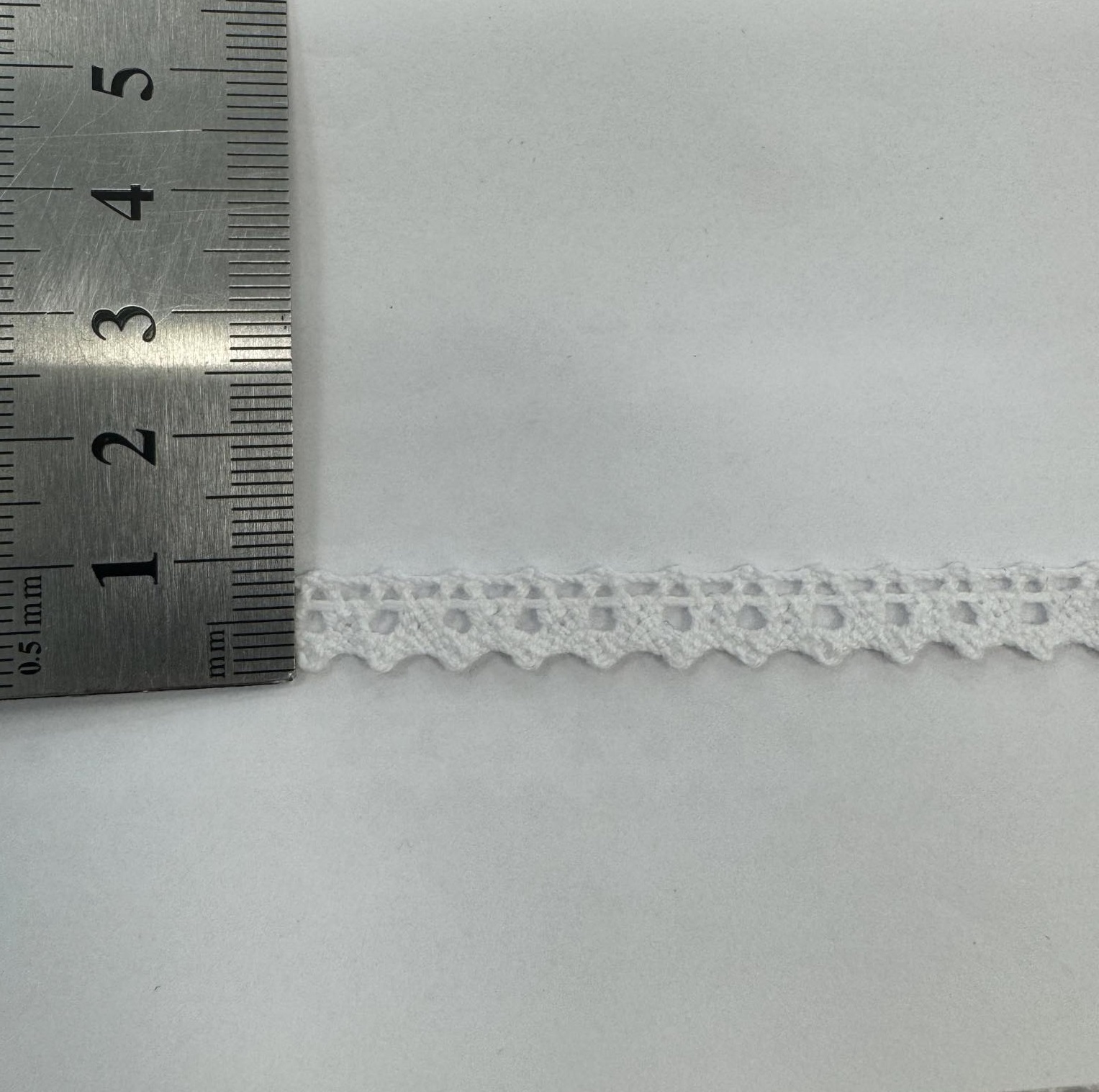 Medvilninis nėrinys, 8 mm, baltas. Medvilniniai nėrinukai yra pastelinių spalvų, įvairių pločių. Medvilninis nėrinukas dažniausiai naudojamas viršutinių rūbų (suknelių, sijonų, palaidinukių, glaustinukių) apatinių bei naktinių drabužių dekoravimui. Medvilninis nėrinukas dekoruojamam rūbui suteikia elegantiškumo bei išskirtinumo. Kiekviena detalė su medvilniniu nėrinuku suteikia seksualumo, apgaubia paslaptingumo skraiste, suteikia orginalumo, seksualumo ir pasitikėjimo savimi. Medvilninis nėrinukai būna marginti įvairiomis formomis, gėlėmis ar šiaip raštais. Šie medvilniniai nėrinukai dažnai naudojami ir rankdarbiams: jais dekoruojami namų apyvokos daiktai, tokie kaip pagalvėlės, servetėlės, staltiesės ir pan., tai gali būti dekoracijos vestuvėms ar krikštynoms. Galima iškarpyti nėrinuko detales ir naudoti įvairiems rankdarbiams ar dekoravimui. Nėrinukus galima derinti su viskoziniu, sintetiniu, plonos ar storos medvilnės trikotažu. Juoselė nėra tampri, matuojama metrais. Priderinkite nėrinuko plotį, spalvą bei raštą prie norimo papuošti rūbo ir tapsite išskirtinė!