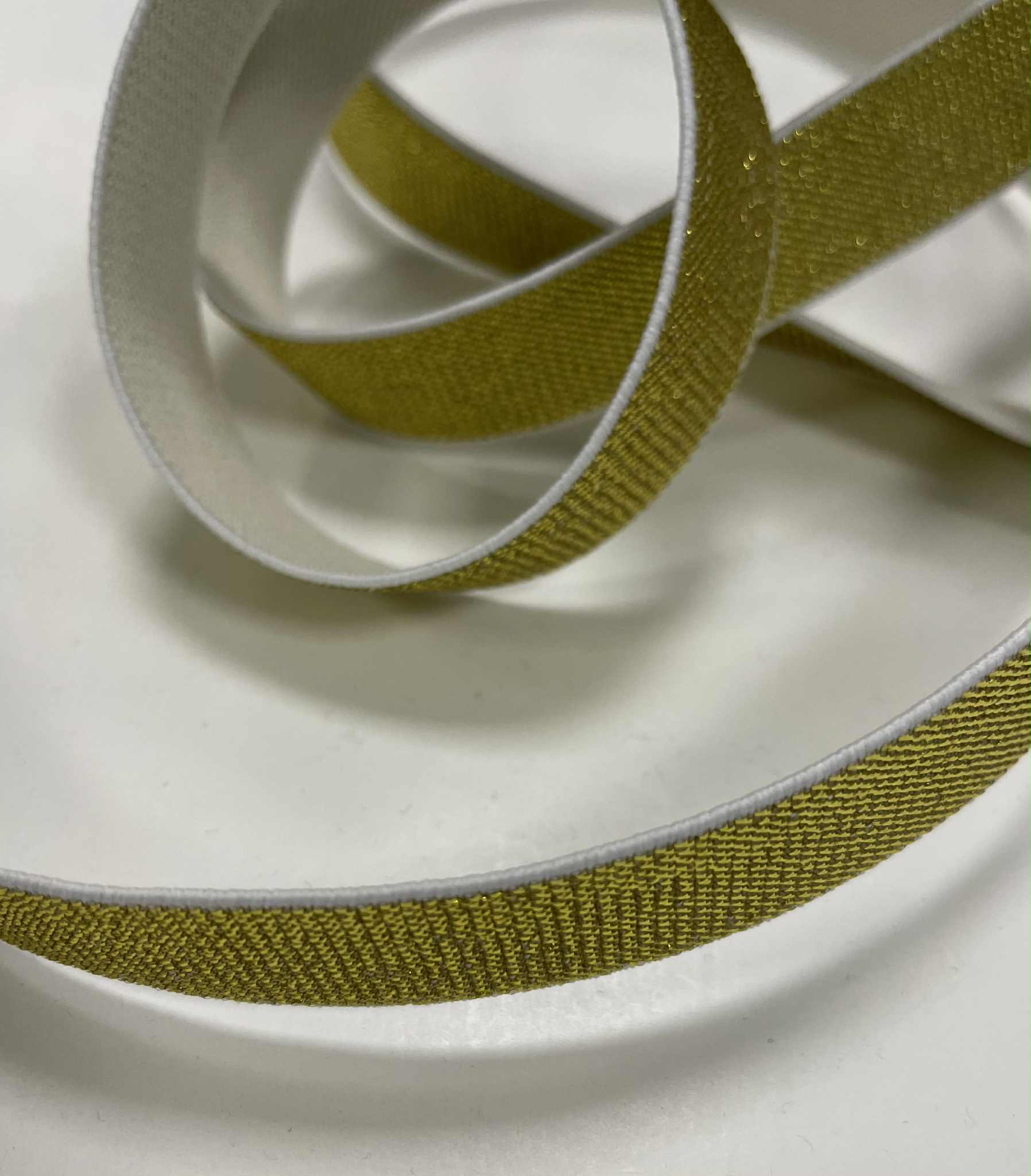 Metalizuota guma 20 mm, Auksinė/balta. Guminė juostelė – tai dažniausiai buityje, rūbų siuvimui naudojama elastinė juostelė. Elastinė juostelė (guma) yra naudojama siuviniuose tam, kad galėtume išgauti gaminio tamprumą atitinkamose jo vietose. Tai viena reikalingiausių priemonių kiekvienos siuvėjos aplinkoje. Gumos būna įvairiausių spalvų, pločio ir net tąsumo. Elastinės juostelės (gumos) būna austos, pintos, apvalios, yra gumos su kilpelėmis sagoms.