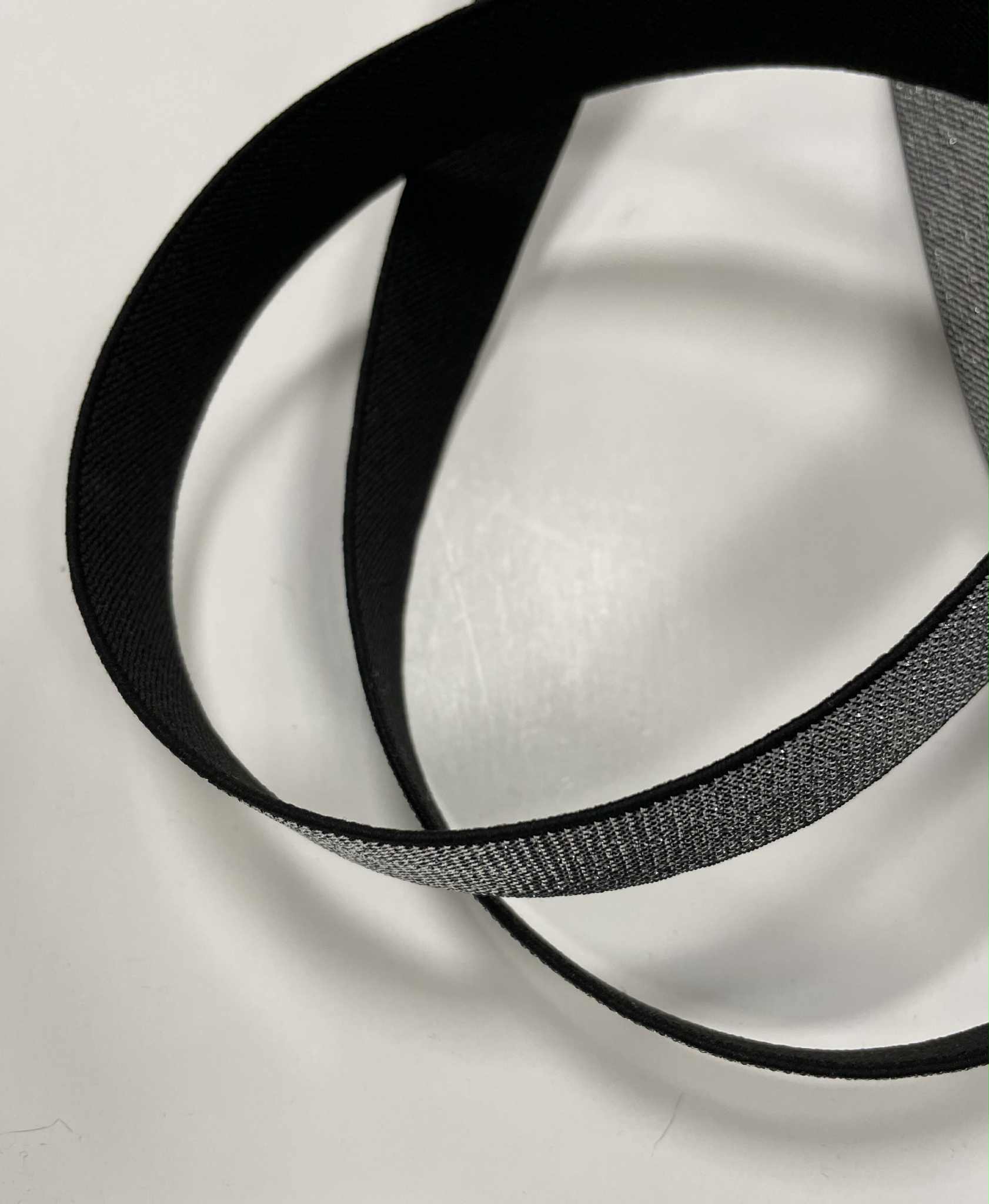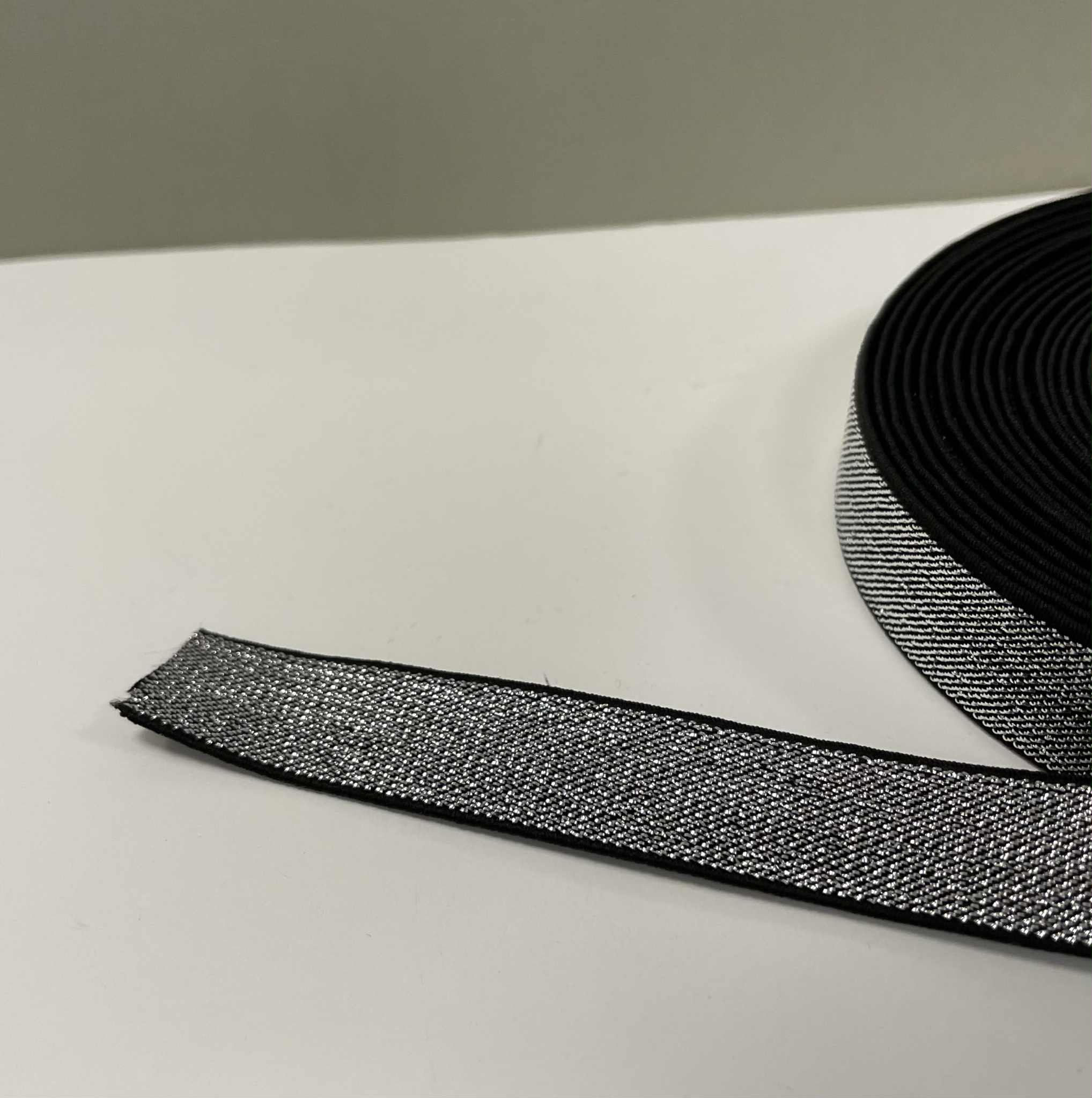 Metalizuota guma 20 mm, Sidabrinė/juoda. Guminė juostelė – tai dažniausiai buityje, rūbų siuvimui naudojama elastinė juostelė. Elastinė juostelė (guma) yra naudojama siuviniuose tam, kad galėtume išgauti gaminio tamprumą atitinkamose jo vietose. Tai viena reikalingiausių priemonių kiekvienos siuvėjos aplinkoje. Gumos būna įvairiausių spalvų, pločio ir net tąsumo. Elastinės juostelės (gumos) būna austos, pintos, apvalios, yra gumos su kilpelėmis sagoms.