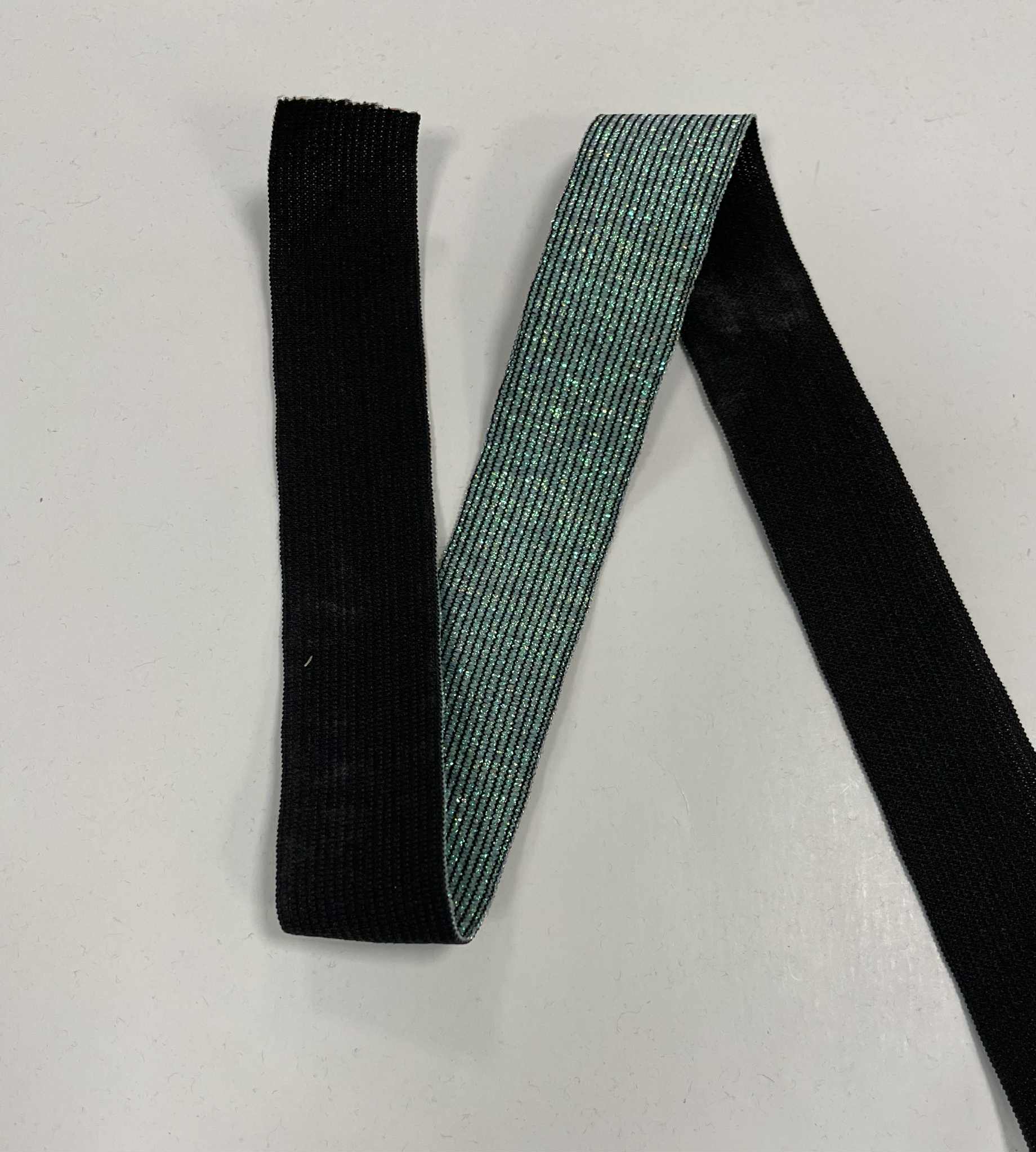 Metalizuota guma 30 mm, Holografinė žalia/juoda. Guminė juostelė – tai dažniausiai buityje, rūbų siuvimui naudojama elastinė juostelė. Elastinė juostelė (guma) yra naudojama siuviniuose tam, kad galėtume išgauti gaminio tamprumą atitinkamose jo vietose. Tai viena reikalingiausių priemonių kiekvienos siuvėjos aplinkoje. Gumos būna įvairiausių spalvų, pločio ir net tąsumo. Elastinės juostelės (gumos) būna austos, pintos, apvalios, yra gumos su kilpelėmis sagoms.