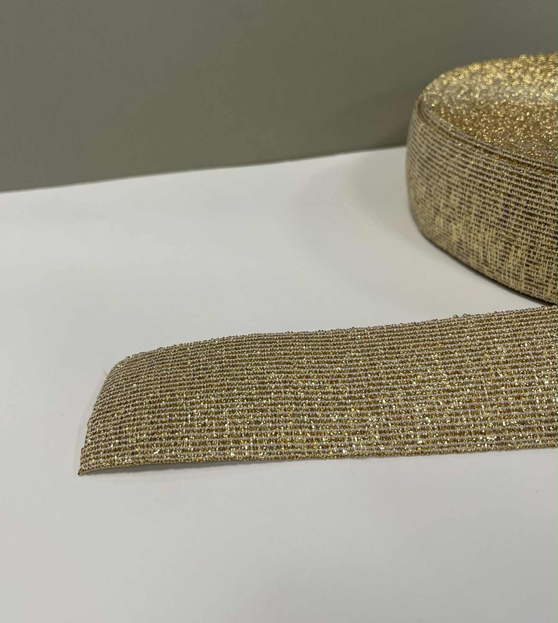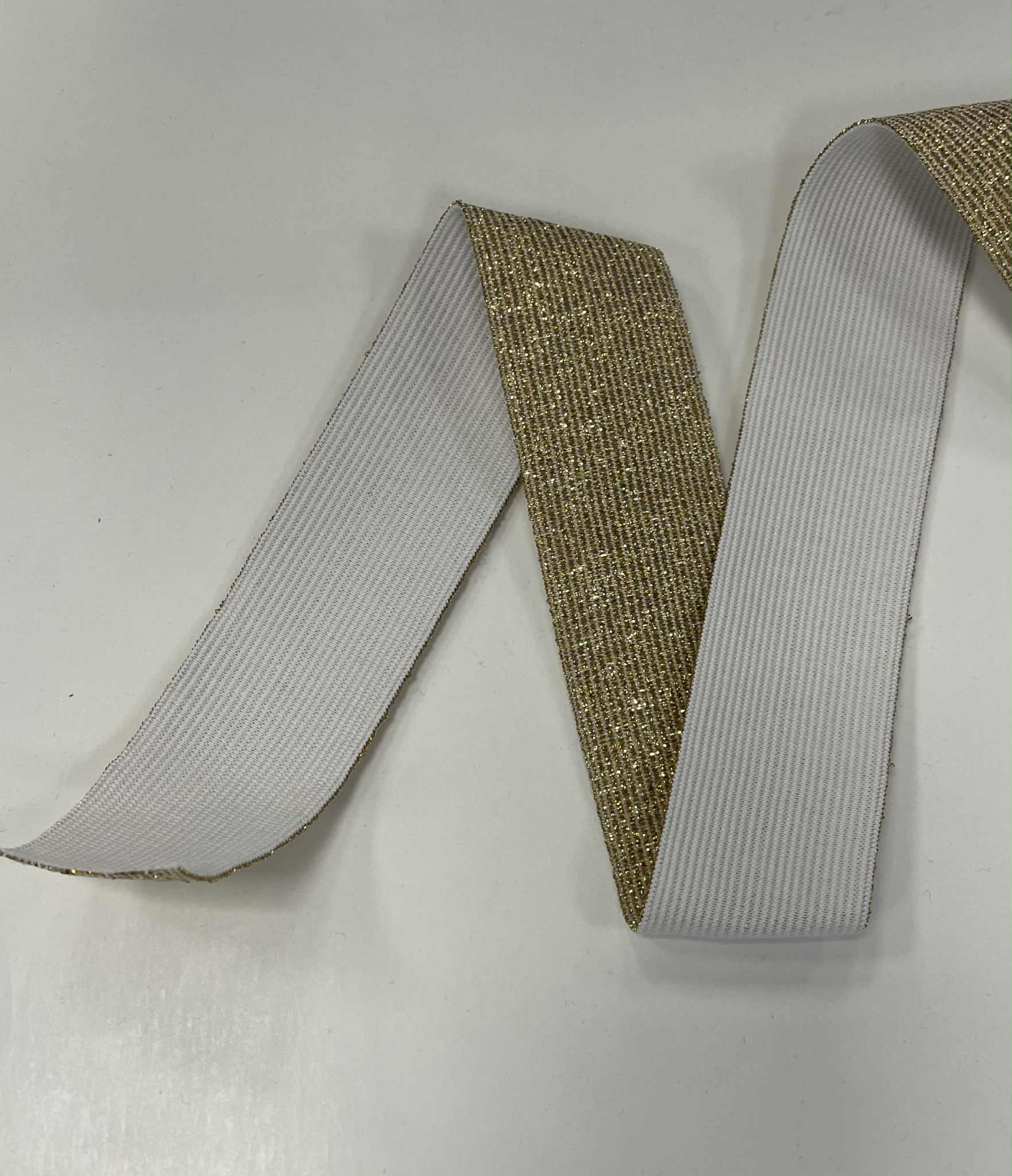 Metalizuota guma 40 mm, auksinė/balta. Guminė juostelė – tai dažniausiai buityje, rūbų siuvimui naudojama elastinė juostelė.  Elastinė juostelė (guma) yra naudojama siuviniuose tam, kad galėtume išgauti gaminio tamprumą atitinkamose jo vietose. Tai viena reikalingiausių priemonių kiekvienos siuvėjos aplinkoje. Gumos būna įvairiausių spalvų, pločio ir net tąsumo. Elastinės juostelės (gumos) būna austos, pintos, apvalios, yra gumos su kilpelėmis sagoms.