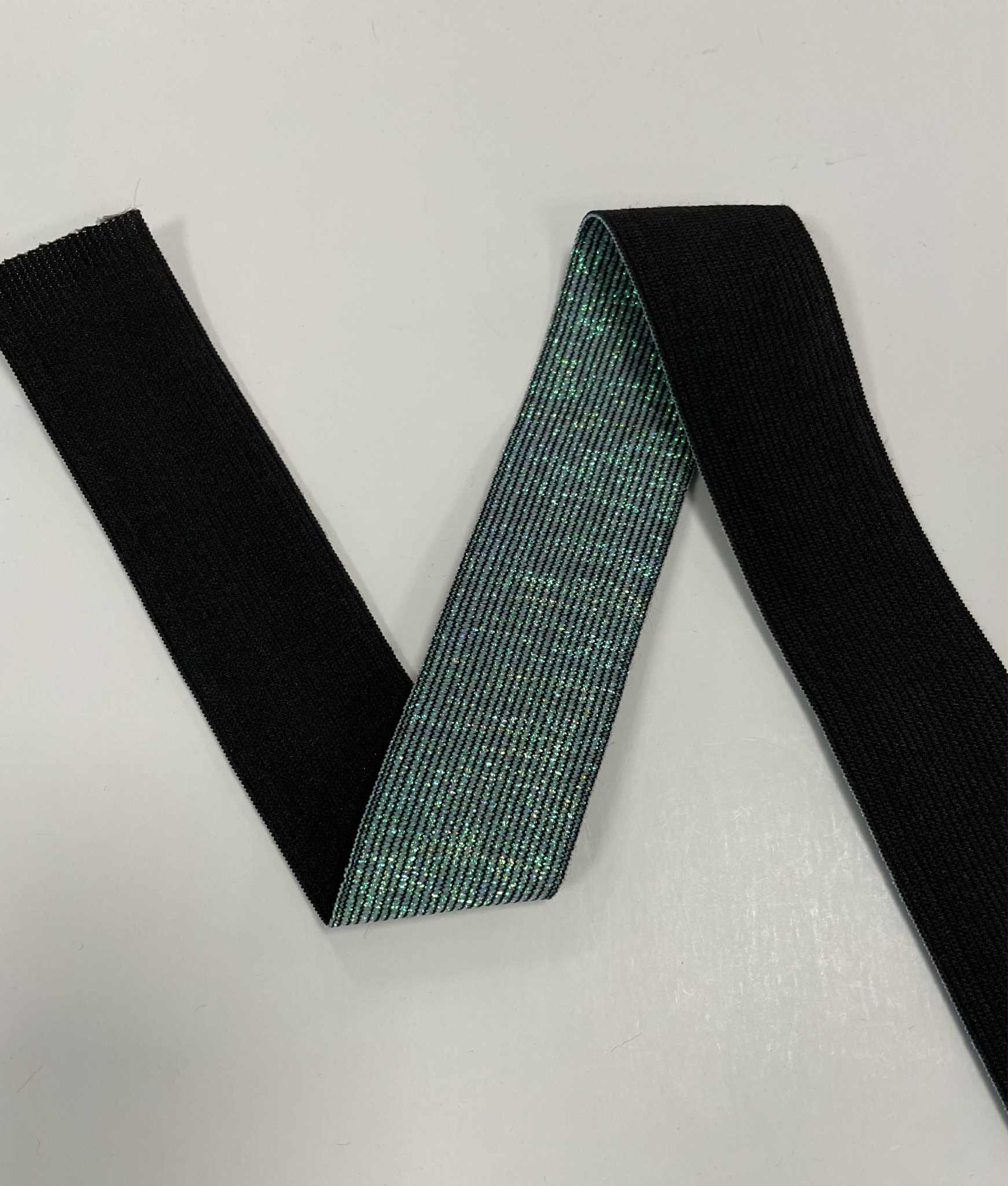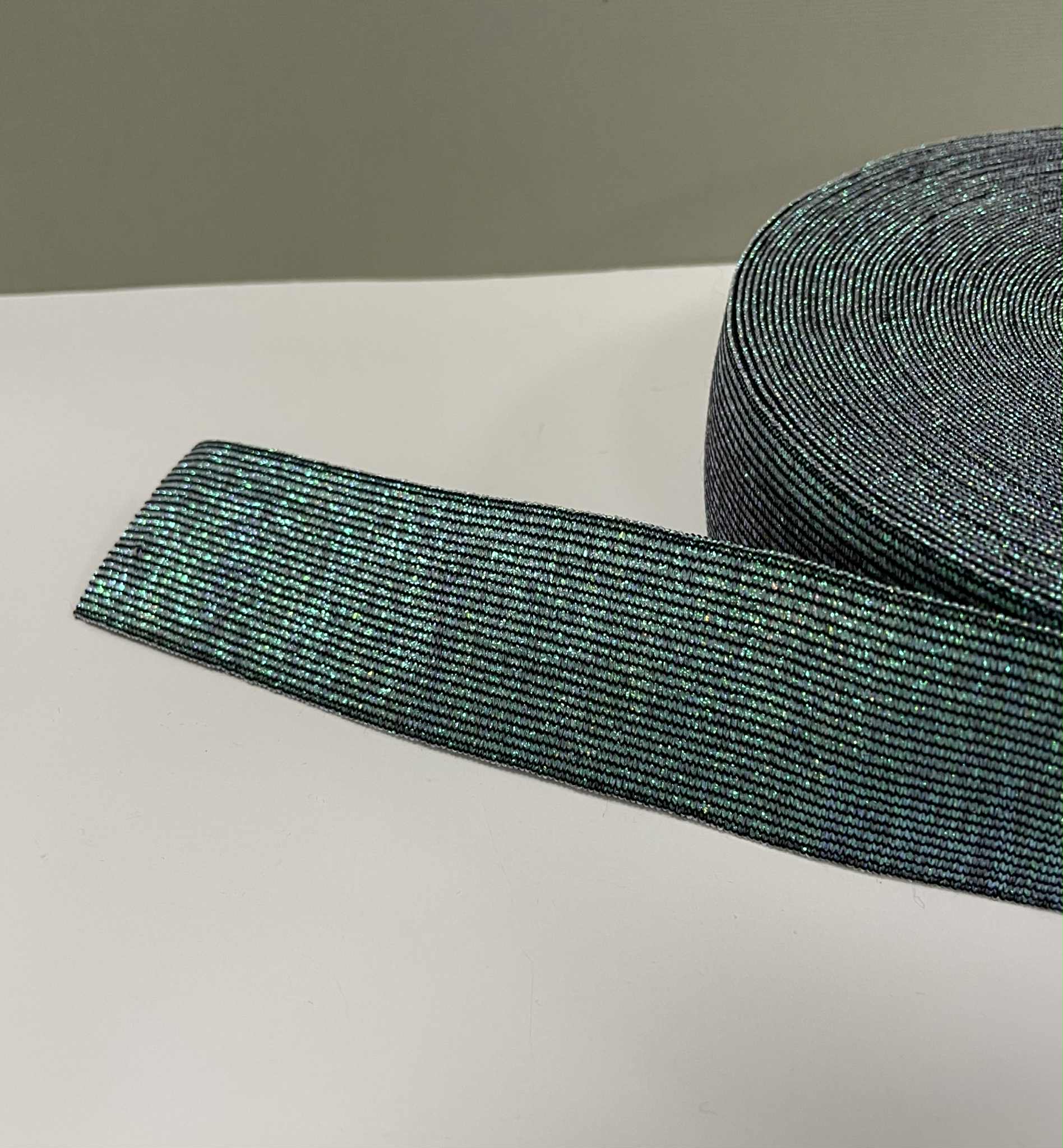 Metalizuota guma 40 mm, Holografinė žalia/juoda. Guminė juostelė – tai dažniausiai buityje, rūbų siuvimui naudojama elastinė juostelė.  Elastinė juostelė (guma) yra naudojama siuviniuose tam, kad galėtume išgauti gaminio tamprumą atitinkamose jo vietose. Tai viena reikalingiausių priemonių kiekvienos siuvėjos aplinkoje. Gumos būna įvairiausių spalvų, pločio ir net tąsumo. Elastinės juostelės (gumos) būna austos, pintos, apvalios, yra gumos su kilpelėmis sagoms.