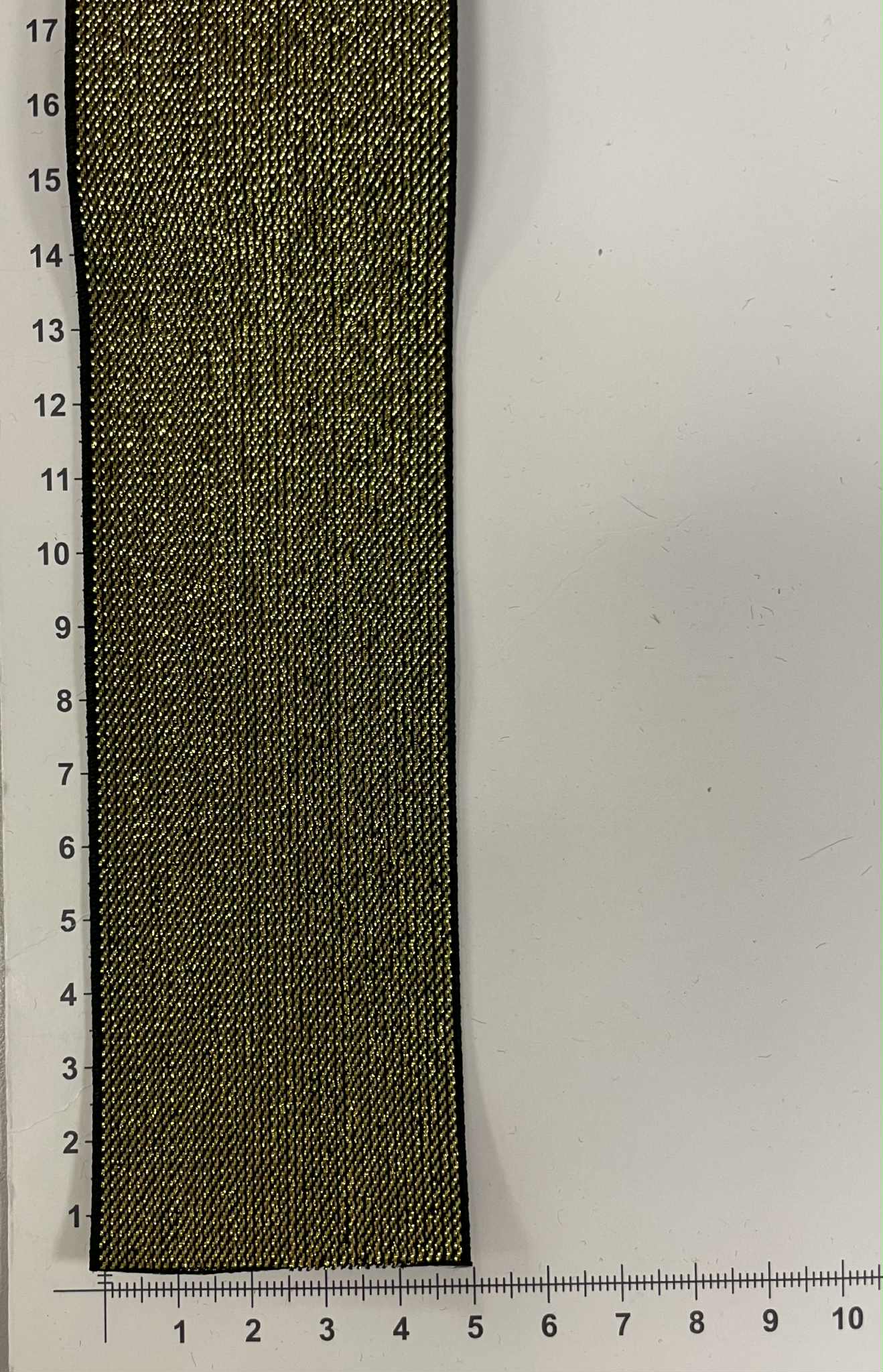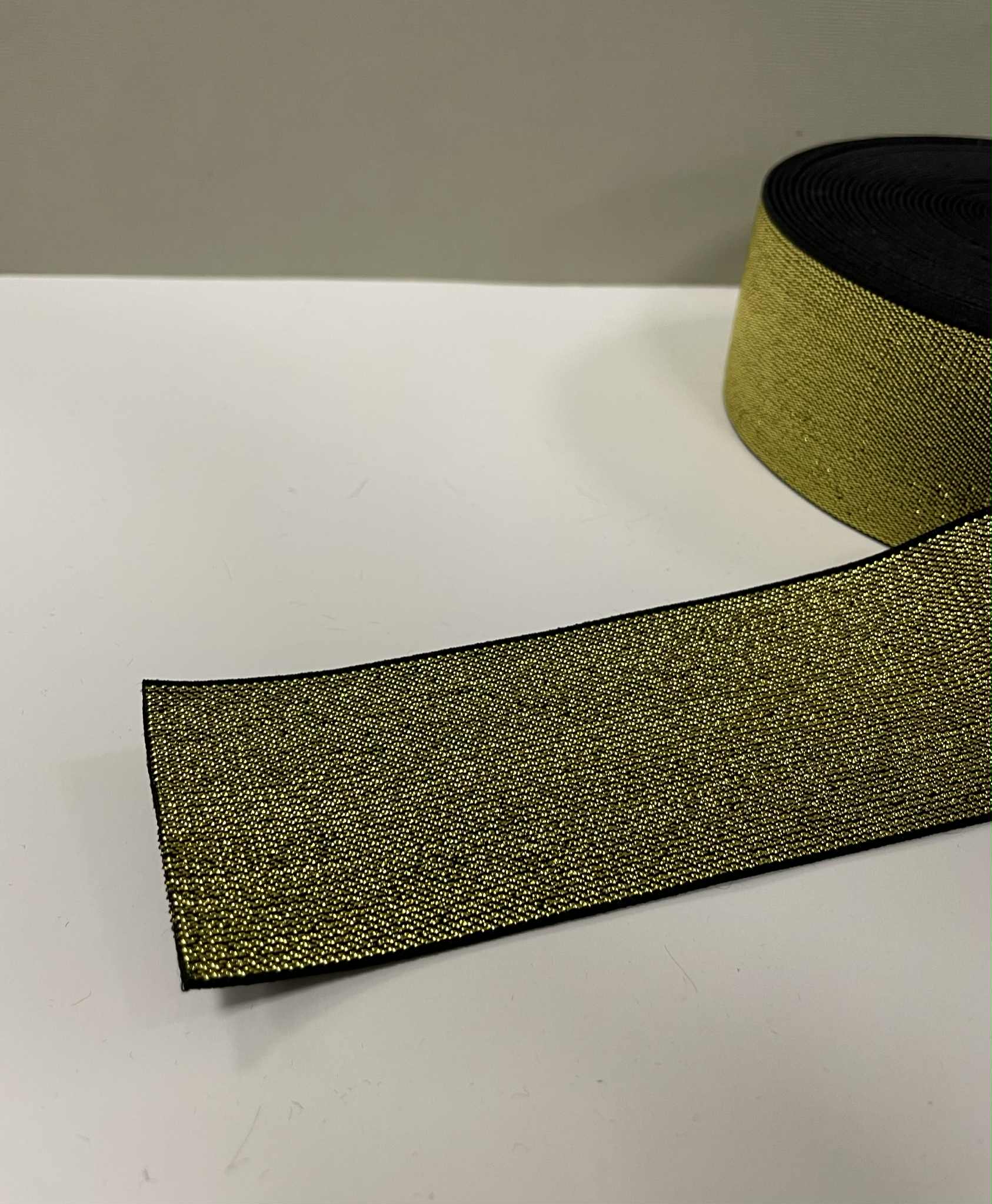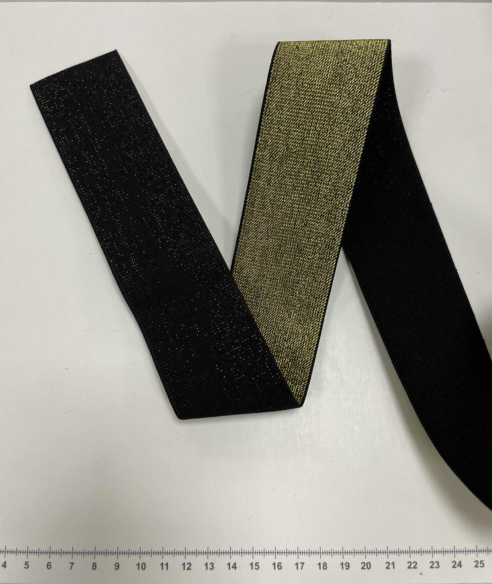Metalizuota guma 50 mm, Auksinė/juoda. Guminė juostelė – tai dažniausiai buityje, rūbų siuvimui naudojama elastinė juostelė.  Elastinė juostelė (guma) yra naudojama siuviniuose tam, kad galėtume išgauti gaminio tamprumą atitinkamose jo vietose. Tai viena reikalingiausių priemonių kiekvienos siuvėjos aplinkoje. Gumos būna įvairiausių spalvų, pločio ir net tąsumo. Elastinės juostelės (gumos) būna austos, pintos, apvalios, yra gumos su kilpelėmis sagoms.