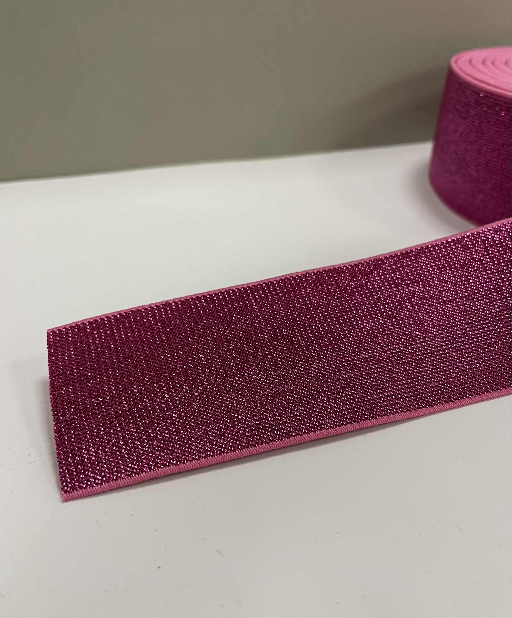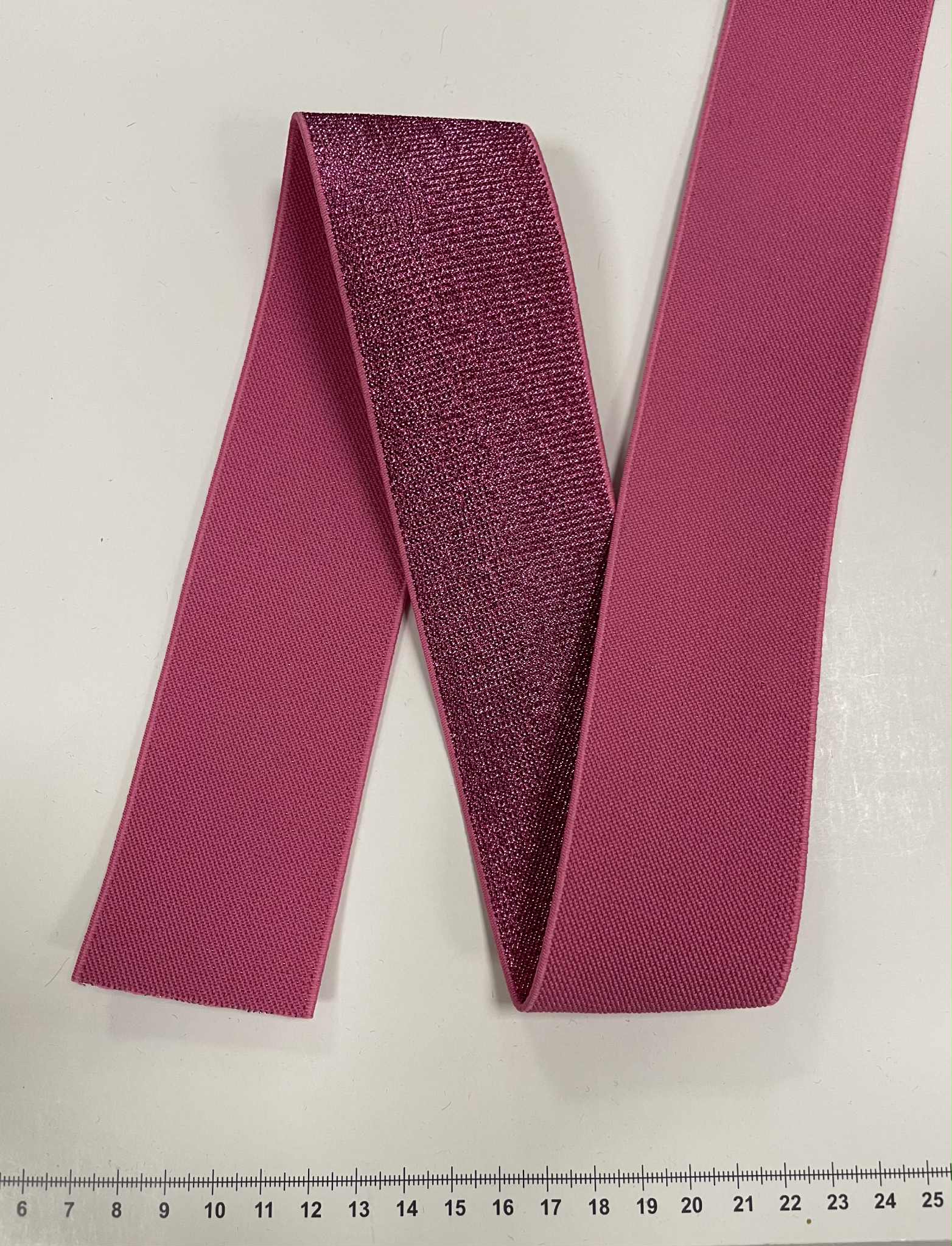 Metalizuota guma 50 mm, Rožinė. Guminė juostelė – tai dažniausiai buityje, rūbų siuvimui naudojama elastinė juostelė.  Elastinė juostelė (guma) yra naudojama siuviniuose tam, kad galėtume išgauti gaminio tamprumą atitinkamose jo vietose. Tai viena reikalingiausių priemonių kiekvienos siuvėjos aplinkoje. Gumos būna įvairiausių spalvų, pločio ir net tąsumo. Elastinės juostelės (gumos) būna austos, pintos, apvalios, yra gumos su kilpelėmis sagoms.