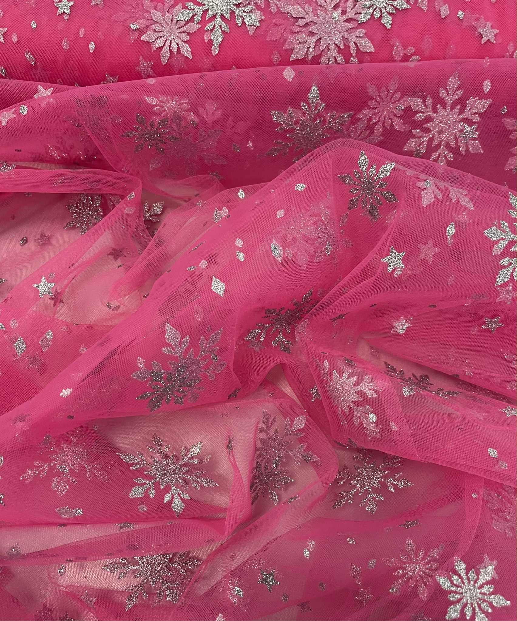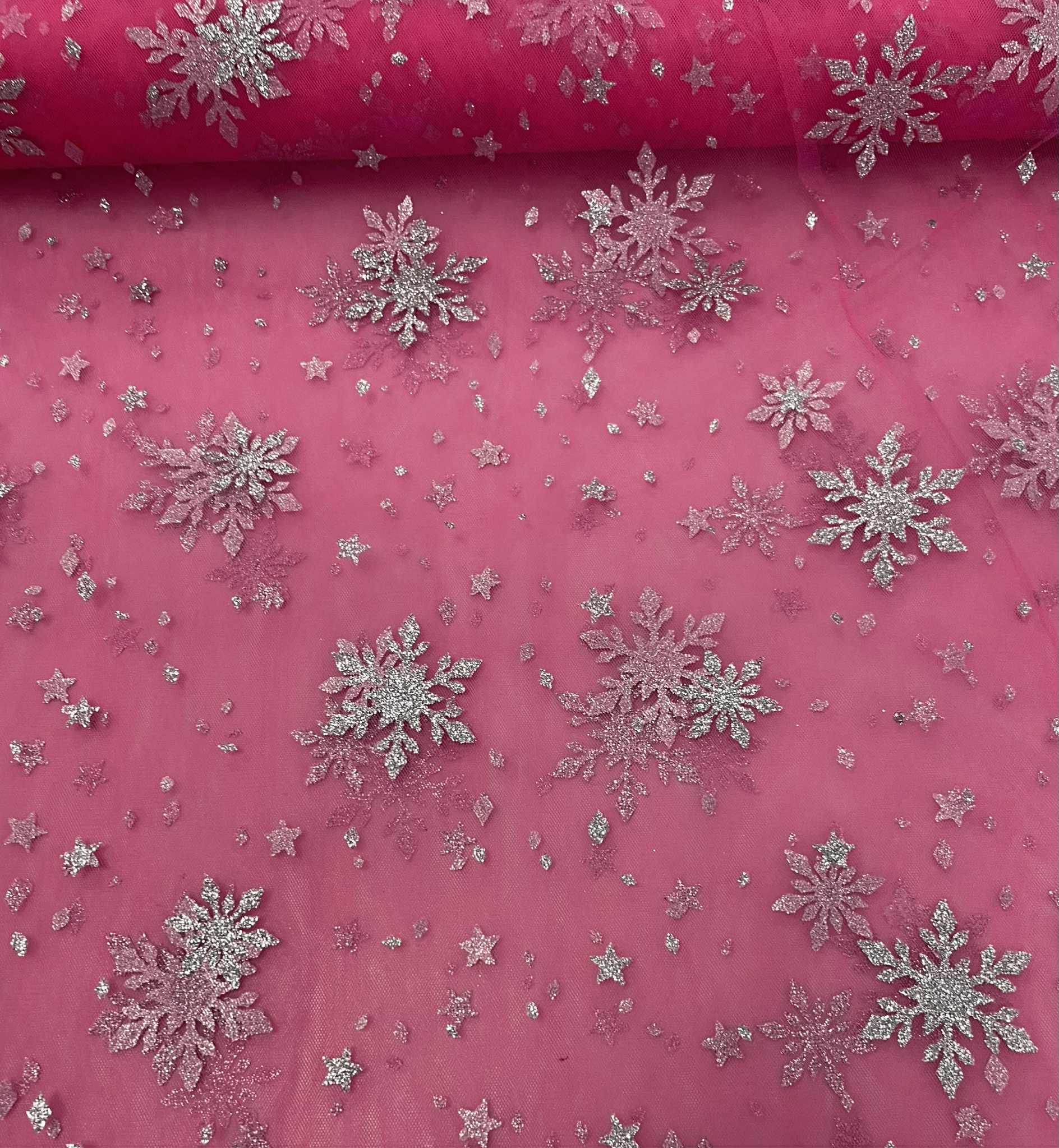 Minkštas tiulis Ryškiai rožinis su blizgančiom snaigėm