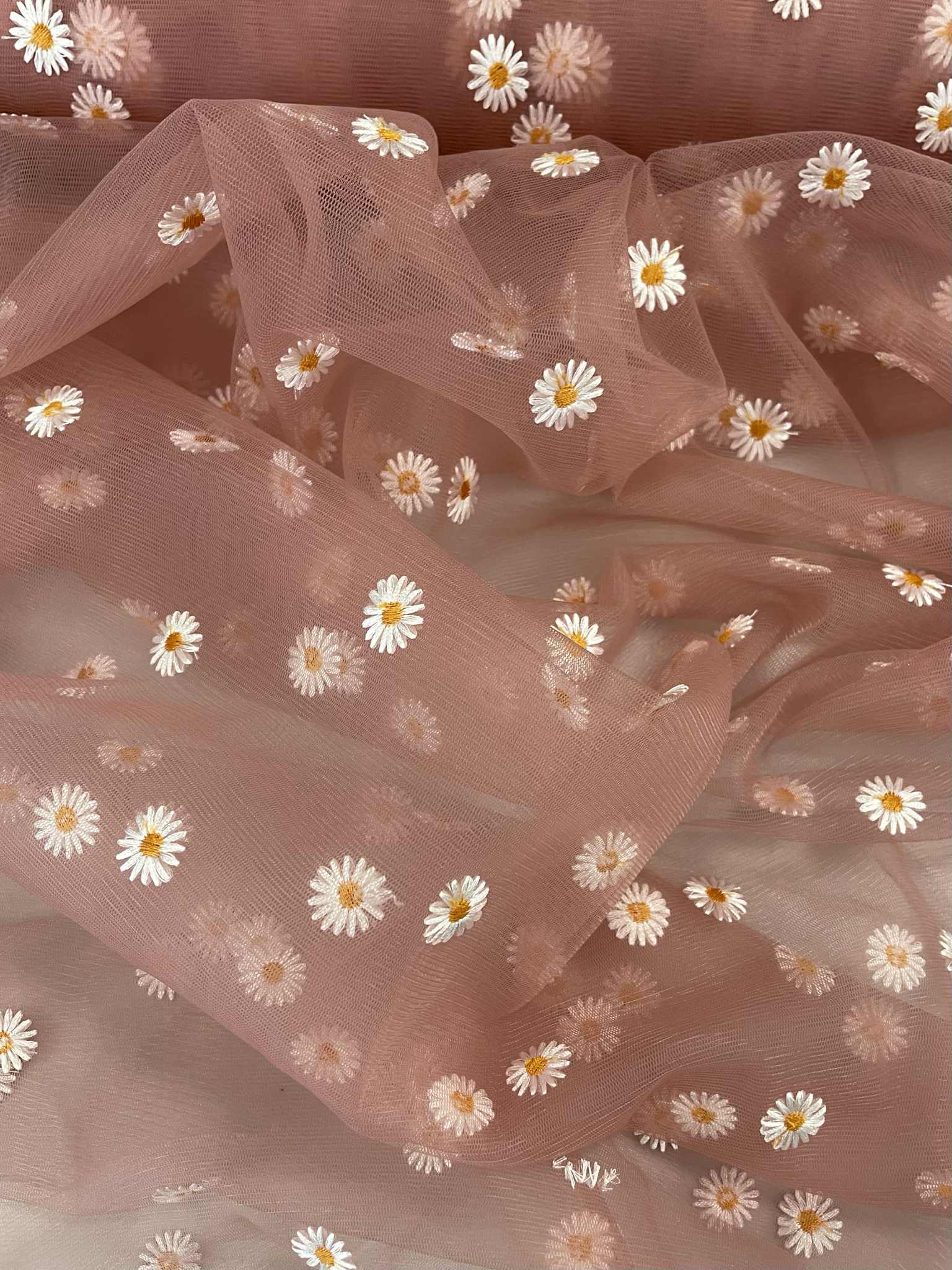 Minkštas tiulis Tamsi pelenų rožė su siuvinėtomis ramunėmis