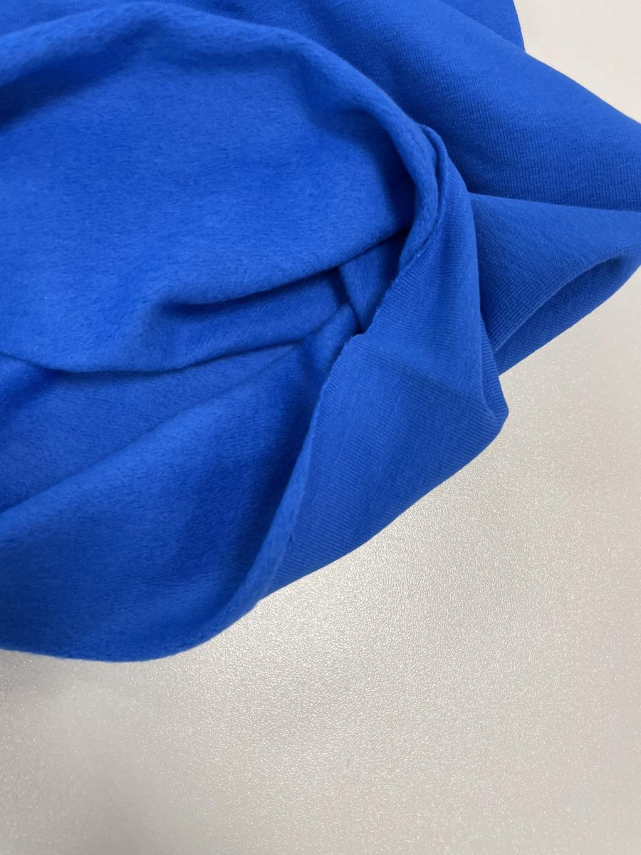 Pašiltintas, nestoras elastingas trikotažas Ryški mėlyna – tai nestoresnas medvilninis trikotažas, vidinė jo pusė yra su pūkeliu, pūkelis yra pilkas, geroji pusė juoda. Medžiaga su elstanu, gerai tempiasi. Šios rūšies trikotažo “blogoji” pusė yra pašiaušta, padengta švelniu pūkeliu, tačiau labai maloni prie kūno. Pūkeliai švelniai liečiasi prie kūno ir maloniai šildo. Trikotažas tinka laisvalaikio rūbų siuvimui – nevaržo judesių, suteikia patogumo ir komforto jausmą. Dažniausiai ši medžiaga naudojamas šiltesnių rūbų siuvimui, skirtų rudeniui/žiemai/pavasariui: kelnėms, bliuzonams, sportiniams komplektams, šiltoms suknelėms, švarkeliams, megztukams, golfams, timpoms, kepurėms bei šalikams. Ypač šis audinys tinka vaikams – pasipuošę rūbais, siūtais iš šio audinio mažieji jausis šiltai ir patogiai. Medžiaga labai praktiška, nereikalauja ypatingos priežiūros. Net ir dažnai skalbiant, bet tinkamai naudojant ir prižiūrint pašiltintas, nestoras elastingas trikotažas Juodas ilgai išlaikys pradinę spalvą, formą ir išliks kokybiškas.