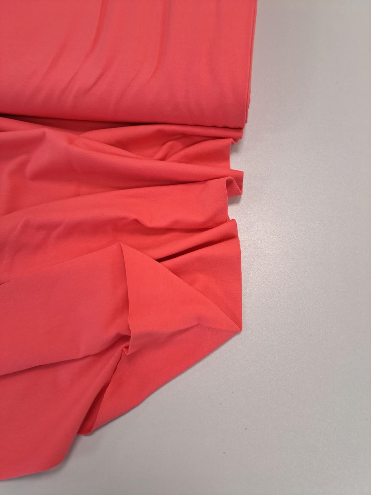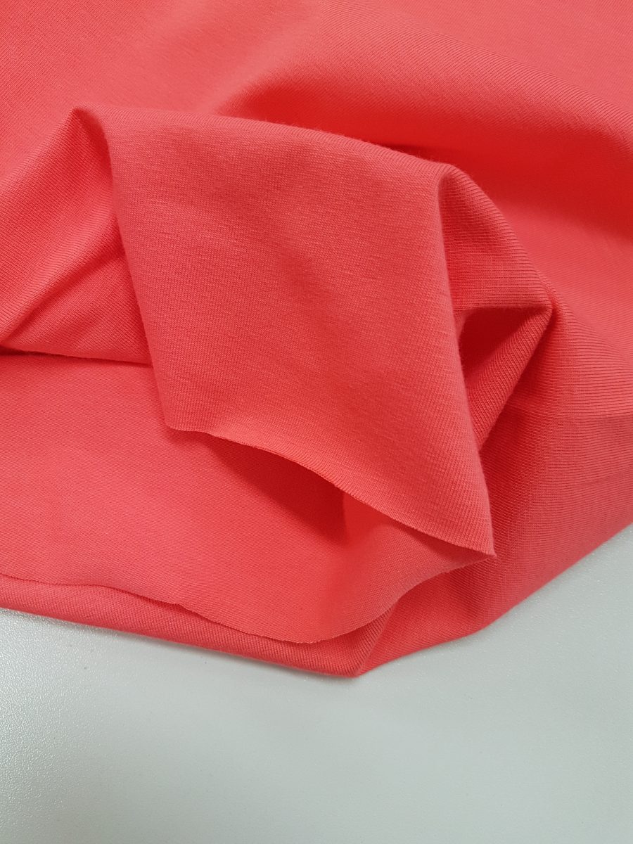 Plonas trikotažas, jersis Ryškus persikas. Plona medvilnė (jersis) – tai plonas, vienspalvis, lengvai krentantis trikotažas. Džersis (jersis) išsiskiria elastingumu ir atsparumu išilginio plyšimo metu. Medžiaga labai praktiška – ji nereikalauja ypatingos priežiūros. Teisingai naudojant ir prižiūrint šis plonas trikotažas, jersis Ryškus persikas ilgai išlaikys pradinę spalvą, formą ir išliks kokybiškas. Suknelės, sijonai, palaidinukės, tunikos, švarkai bei tamprės pasiūtos iš džersio (jersio) atrodo puikiai, nes medžiaga lengvai apgaubia kūną ir išryškina figūros linijas. Be to, jis suteikia judėjimo laisvę ir begalinį komfortą, nes elastano dėka nevaržo judesių. Ši plona medvilnė (jersis) gali būti naudojama ir kaip storesnio audinio rūbų pamušalas. Kepurės, skatelės, galvos juostos, bandanos – ir dar daug įvairiausių galvos dangalų, pasiūtų iš šios plonos medvilnės (jersio) apsaugos galvą nuo saulės ar vėjo, bet tuo pačiu leis odai kvėpuoti, neprakaituos.