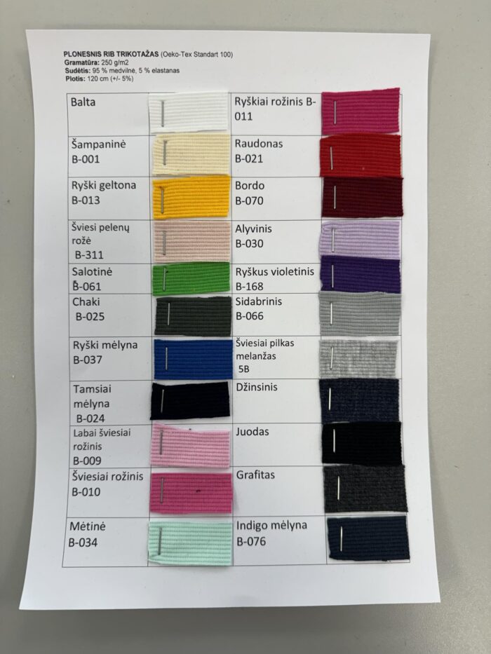 Plonesnio 250 g/m2 rib trikotažo spalvų paletė