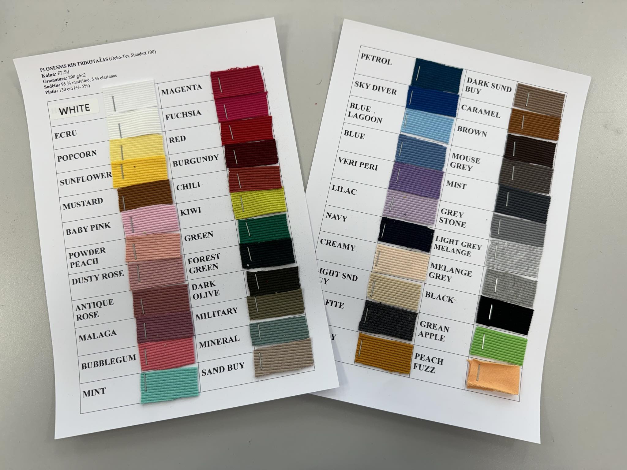 Plonesnio 290 g/m2 rib trikotažo spalvų paletė