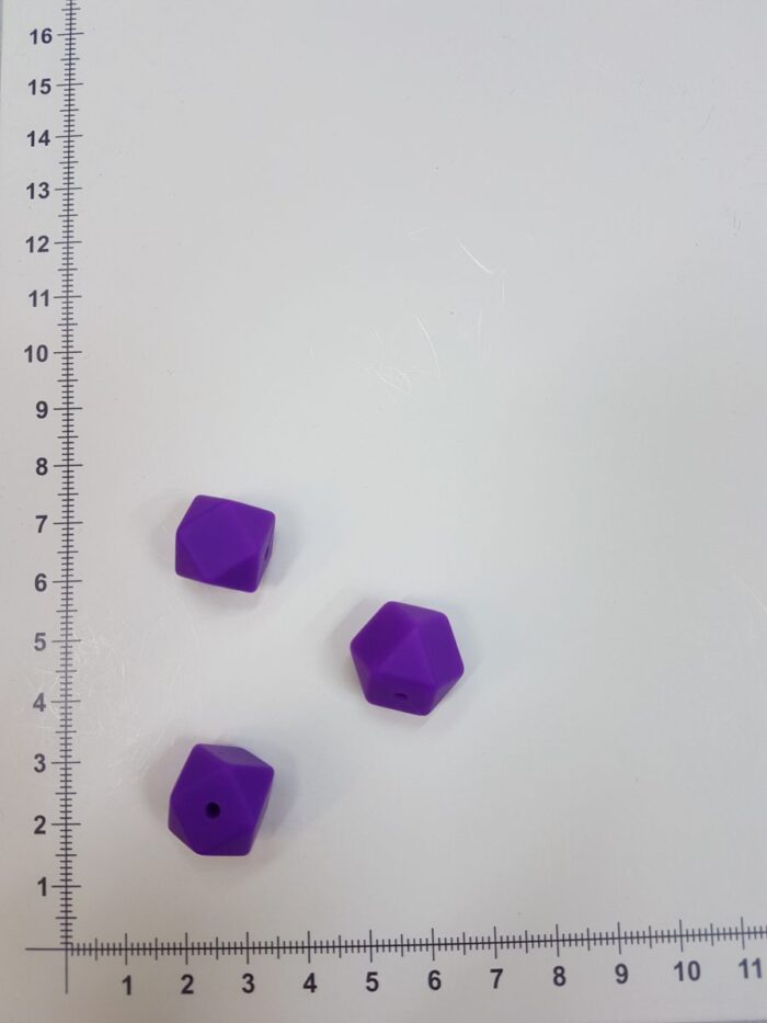 Silikoninis šešiakampis 14 mm, Alyvinis yra skirtas rankdarbims. Dažniausiai naudojamas verti kūdikio čiultuko laikikliui. Silikoniniai čiulptukų laikikliai tampa vis madingesni, nes yra daug patogesni priežiūros atžvilgiu, tuo pačiu malonesni patiems kūdikiams. Silikoniniai karoliukai yra minkšti, pagaminti iš saugaus maistinio silikono, be BPA, fosfatų, švino ir kitų kenksmingų medžiagų. Karoliukai atsparūs seilėms ir kitai drėgmei. Tai puiki pagalbinė priemonė dygstantiems dantukams. Minkštas silikonas nepažeidžia dantenų ir mažina diskomfortą dantukų dygimo laikotarpiu. Šiuos karoliukus galima naudoti ir papuošalų gamyboje: apyrankės, karoliai, įvairūs papuošaliukai, pagaminti iš silikoninių karoliukų atrodo žavingai, yra ilgalaikiai, o jų priežiūra nesudėtinga. Silikoninių karoliukų turime įvairaus skersmens (nuo 9 mm iki 19 mm), įvairių spalvų bei formų. Kūdikiui šiuos karoliukus lytėti yra saugu ir naudinga – liečiant skirtingas formas mažylis susipažįsta su pasauliu, plečia vaizduotę, taip lavėja ir jo smulkioji motorika. Išsirinkite karoliukus ir sukurkite išskirtinį čiulptuko ar kramtuko laikiklį savo kūdikiui! Silikoninis šešiakampis karoliukas yra nelygiu pavišiumi, kampuotas, tačiau saugus kūdikiui. Karoliukas per vidurį turi vėrimo skylutę.