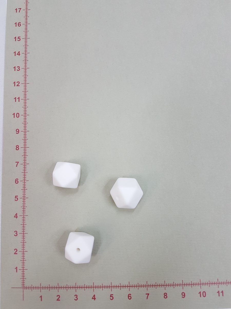 Silikoninis šešiakampis 14 mm, Baltas yra skirtas rankdarbims. Dažniausiai naudojamas verti kūdikio čiultuko laikikliui. Silikoniniai čiulptukų laikikliai tampa vis madingesni, nes yra daug patogesni priežiūros atžvilgiu, tuo pačiu malonesni patiems kūdikiams. Silikoniniai karoliukai yra minkšti, pagaminti iš saugaus maistinio silikono, be BPA, fosfatų, švino ir kitų kenksmingų medžiagų. Karoliukai atsparūs seilėms ir kitai drėgmei. Tai puiki pagalbinė priemonė dygstantiems dantukams. Minkštas silikonas nepažeidžia dantenų ir mažina diskomfortą dantukų dygimo laikotarpiu. Šiuos karoliukus galima naudoti ir papuošalų gamyboje: apyrankės, karoliai, įvairūs papuošaliukai, pagaminti iš silikoninių karoliukų atrodo žavingai, yra ilgalaikiai, o jų priežiūra nesudėtinga. Silikoninių karoliukų turime įvairaus skersmens (nuo 9 mm iki 19 mm), įvairių spalvų bei formų. Kūdikiui šiuos karoliukus lytėti yra saugu ir naudinga – liečiant skirtingas formas mažylis susipažįsta su pasauliu, plečia vaizduotę, taip lavėja ir jo smulkioji motorika. Išsirinkite karoliukus ir sukurkite išskirtinį čiulptuko ar kramtuko laikiklį savo kūdikiui! Silikoninis šešiakampis karoliukas yra nelygiu pavišiumi, kampuotas, tačiau saugus kūdikiui. Karoliukas per vidurį turi vėrimo skylutę.