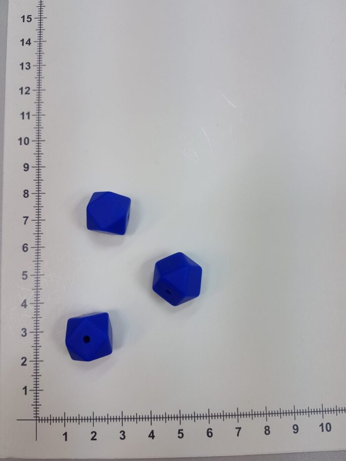 Silikoninis šešiakampis 14 mm, Karališkas mėlynas yra skirtas rankdarbims. Dažniausiai naudojamas verti kūdikio čiultuko laikikliui. Silikoniniai čiulptukų laikikliai tampa vis madingesni, nes yra daug patogesni priežiūros atžvilgiu, tuo pačiu malonesni patiems kūdikiams. Silikoniniai karoliukai yra minkšti, pagaminti iš saugaus maistinio silikono, be BPA, fosfatų, švino ir kitų kenksmingų medžiagų. Karoliukai atsparūs seilėms ir kitai drėgmei. Tai puiki pagalbinė priemonė dygstantiems dantukams. Minkštas silikonas nepažeidžia dantenų ir mažina diskomfortą dantukų dygimo laikotarpiu. Šiuos karoliukus galima naudoti ir papuošalų gamyboje: apyrankės, karoliai, įvairūs papuošaliukai, pagaminti iš silikoninių karoliukų atrodo žavingai, yra ilgalaikiai, o jų priežiūra nesudėtinga. Silikoninių karoliukų turime įvairaus skersmens (nuo 9 mm iki 19 mm), įvairių spalvų bei formų. Kūdikiui šiuos karoliukus lytėti yra saugu ir naudinga – liečiant skirtingas formas mažylis susipažįsta su pasauliu, plečia vaizduotę, taip lavėja ir jo smulkioji motorika. Išsirinkite karoliukus ir sukurkite išskirtinį čiulptuko ar kramtuko laikiklį savo kūdikiui! Silikoninis šešiakampis karoliukas yra nelygiu pavišiumi, kampuotas, tačiau saugus kūdikiui. Karoliukas per vidurį turi vėrimo skylutę.